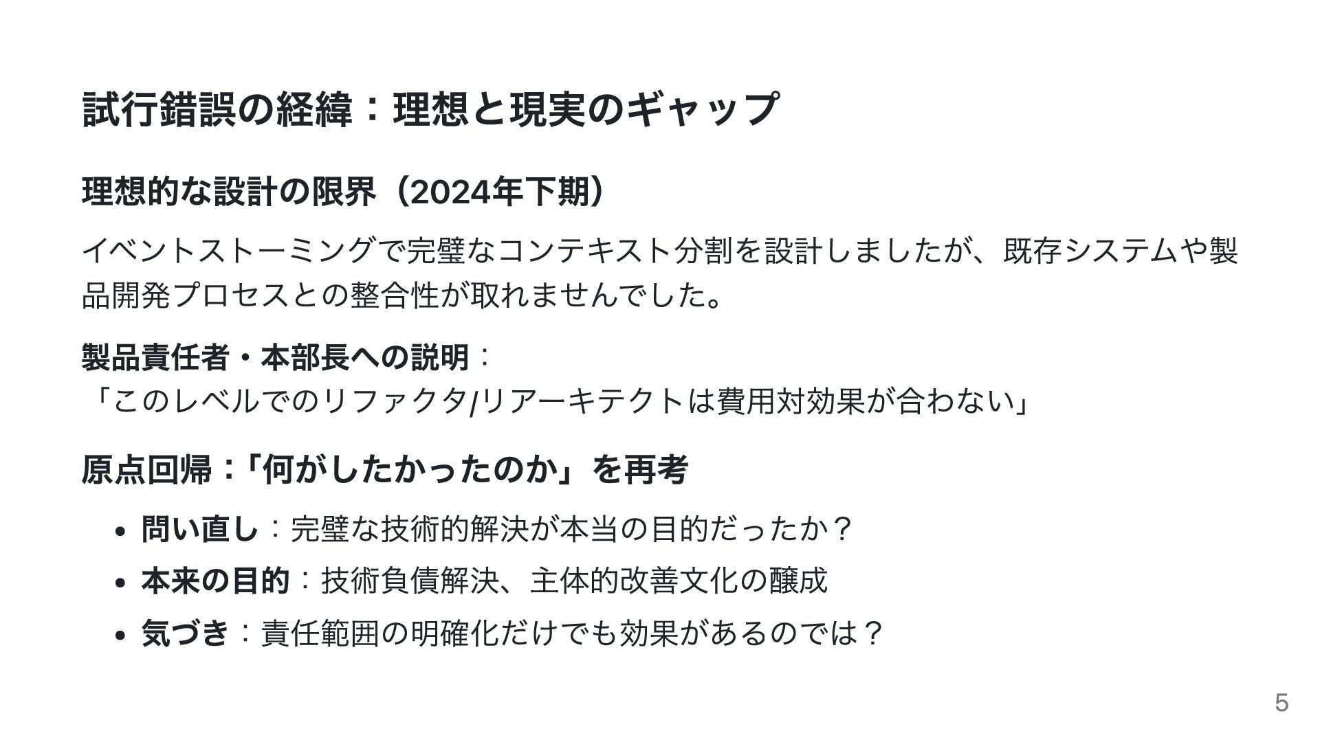 試行錯誤の経緯:理想と現実のギャップ 理想的な設計の限界(2024年下期) イベントストーミングで完璧なコンテキスト分割を設計しましたが、既存システムや製 品開発プロセスとの整合性が取れませんでした。 製品責任者・本部長への説明: 「このレベルでのリファクタ/リアーキテクトは費用対効果が合わない」 原点回帰: 「何がしたかったのか」を再考 問い直し:完璧な技術的解決が本当の目的だったか? 本来の目的:技術負債解決、主体的改善文化の醸成