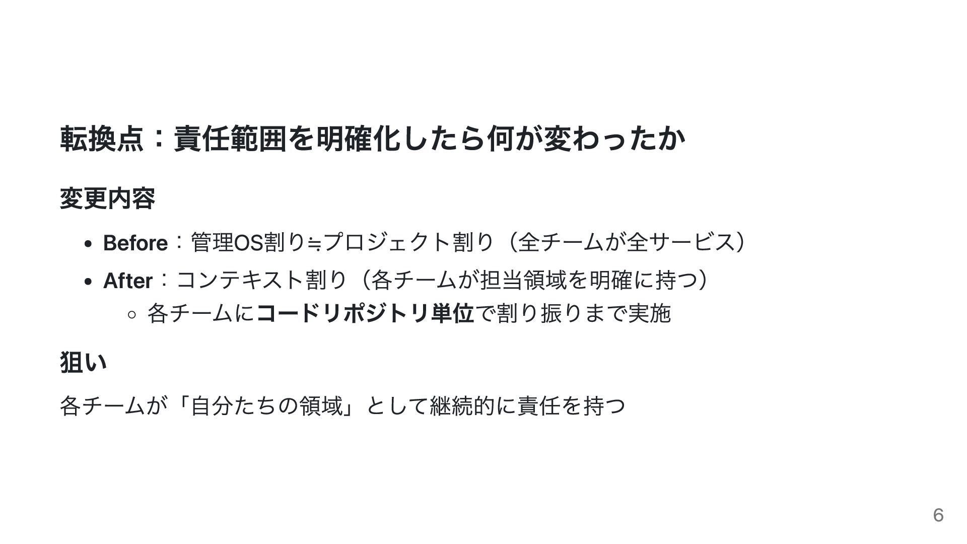 転換点:責任範囲を明確化したら何が変わったか 変更内容 Before:管理OS割り≒プロジェクト割り(全チームが全サービス) After:コンテキスト割り(各チームが担当領域を明確に持つ) 各チームにコードリポジトリ単位で割り振りまで実施 狙い 各チームが「自分たちの領域」として継続的に責任を持つ 6