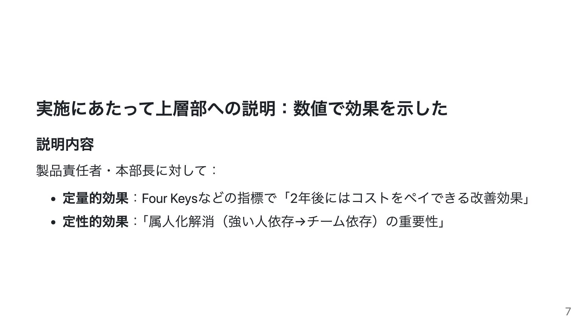 実施にあたって上層部への説明:数値で効果を示した 説明内容 製品責任者・本部長に対して: 定量的効果:Four Keysなどの指標で「2年後にはコストをペイできる改善効果」 定性的効果: 「属人化解消(強い人依存→チーム依存)の重要性」 7
