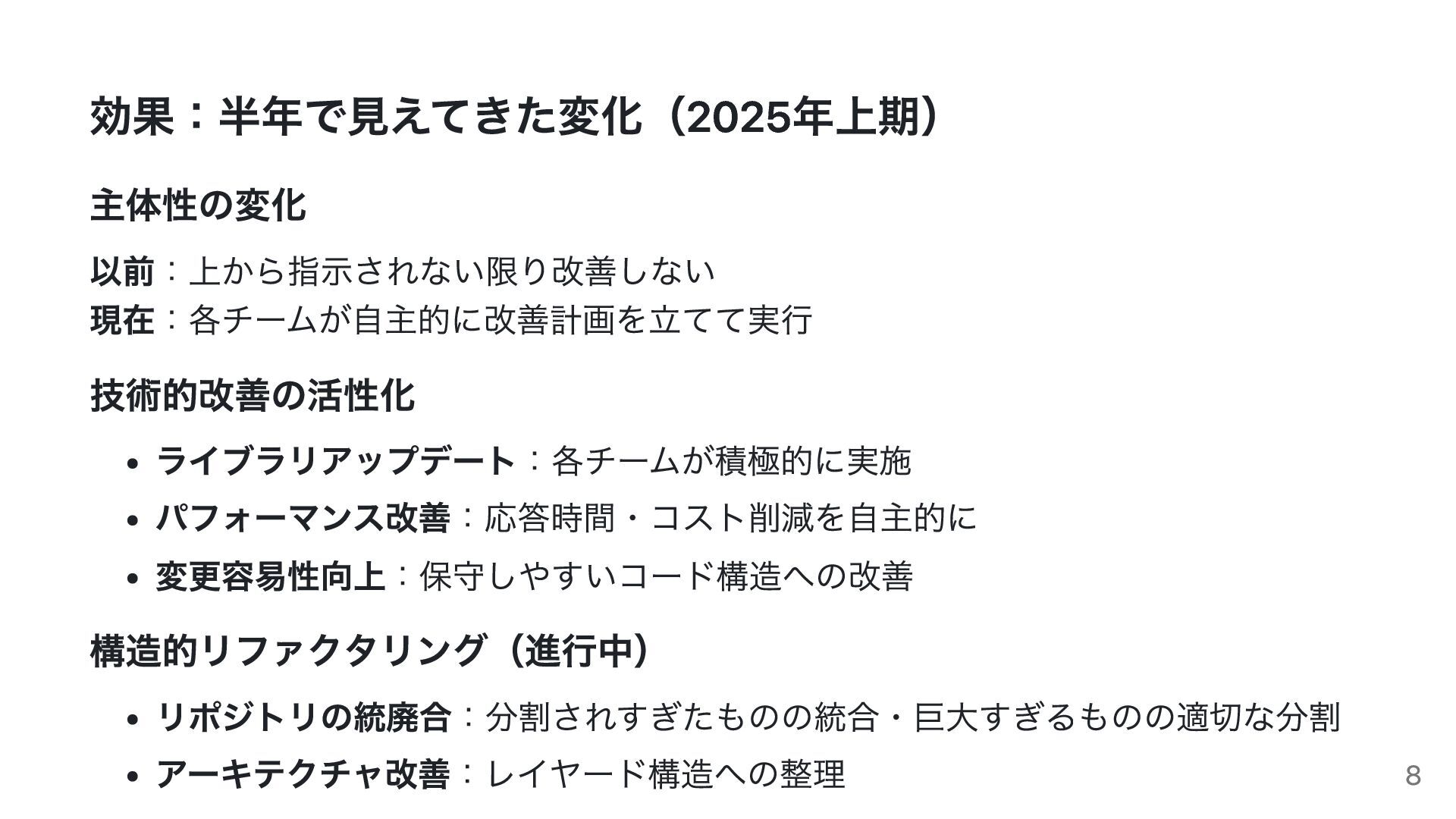 効果:半年で見えてきた変化(2025年上期) 主体性の変化 以前:上から指示されない限り改善しない 現在:各チームが自主的に改善計画を立てて実行 技術的改善の活性化 ライブラリアップデート:各チームが積極的に実施 パフォーマンス改善:応答時間・コスト削減を自主的に 変更容易性向上:保守しやすいコード構造への改善 構造的リファクタリング(進行中) リポジトリの統廃合:分割されすぎたものの統合・巨大すぎるものの適切な分割