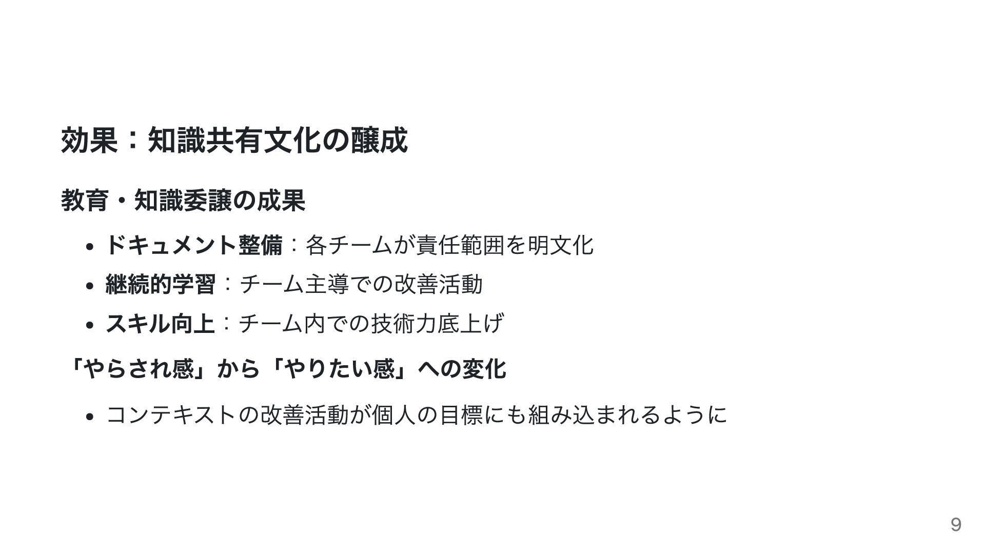 効果:知識共有文化の醸成 教育・知識委譲の成果 ドキュメント整備:各チームが責任範囲を明文化 継続的学習:チーム主導での改善活動 スキル向上:チーム内での技術力底上げ 「やらされ感」から「やりたい感」への変化 コンテキストの改善活動が個人の目標にも組み込まれるように 9