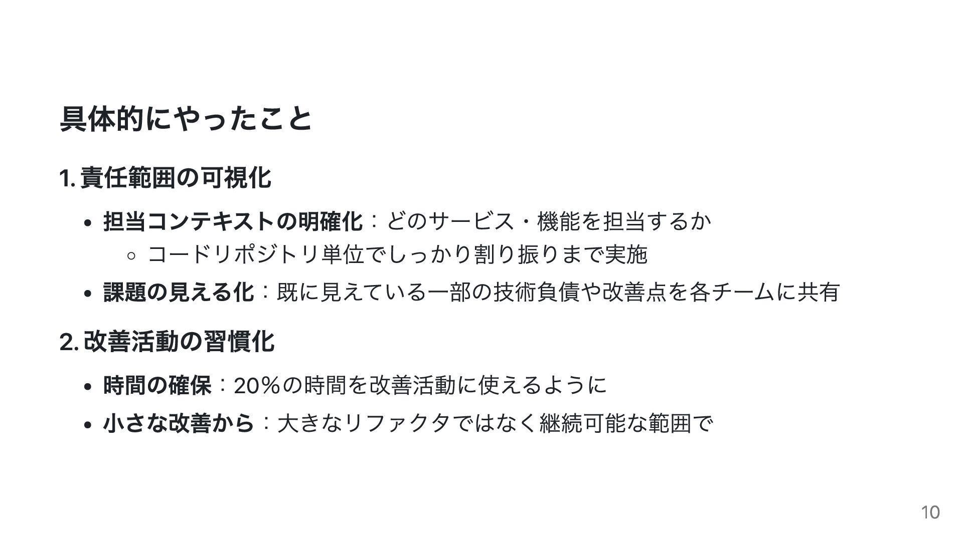 具体的にやったこと 1. 責任範囲の可視化 担当コンテキストの明確化:どのサービス・機能を担当するか コードリポジトリ単位でしっかり割り振りまで実施 課題の見える化:既に見えている一部の技術負債や改善点を各チームに共有 2. 改善活動の習慣化 時間の確保:20%の時間を改善活動に使えるように 小さな改善から:大きなリファクタではなく継続可能な範囲で