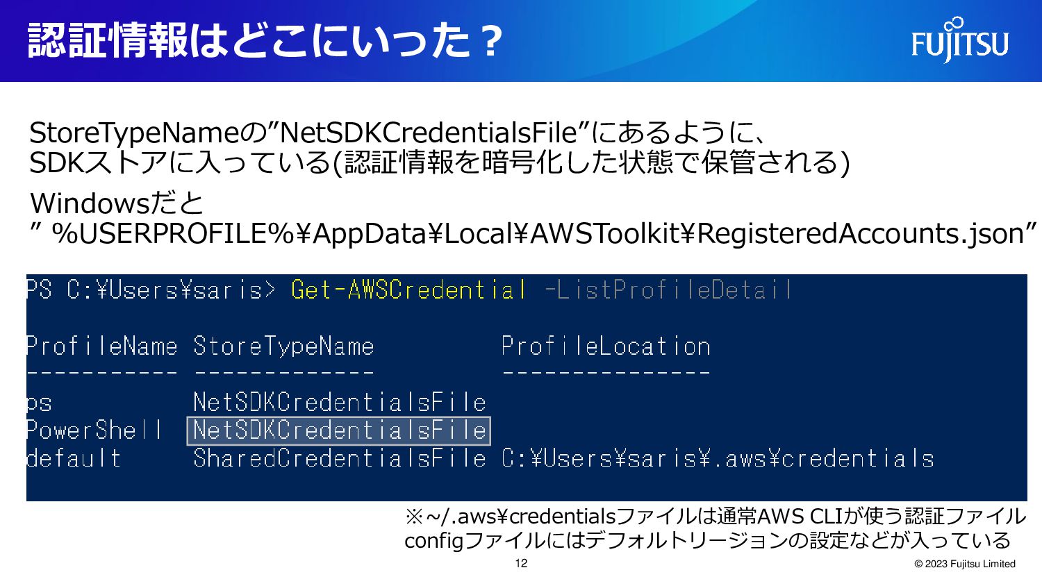 認証情報はどこにいった? StoreTypeNameの”NetSDKCredentialsFile”にあるように、 SDKストアに入っている(認証情報を暗号化した状態で保管される) Windowsだと ” %USERPROFILE%¥AppData¥Local¥AWSToolkit¥RegisteredAccounts.json” © 2023 Fujitsu Limited