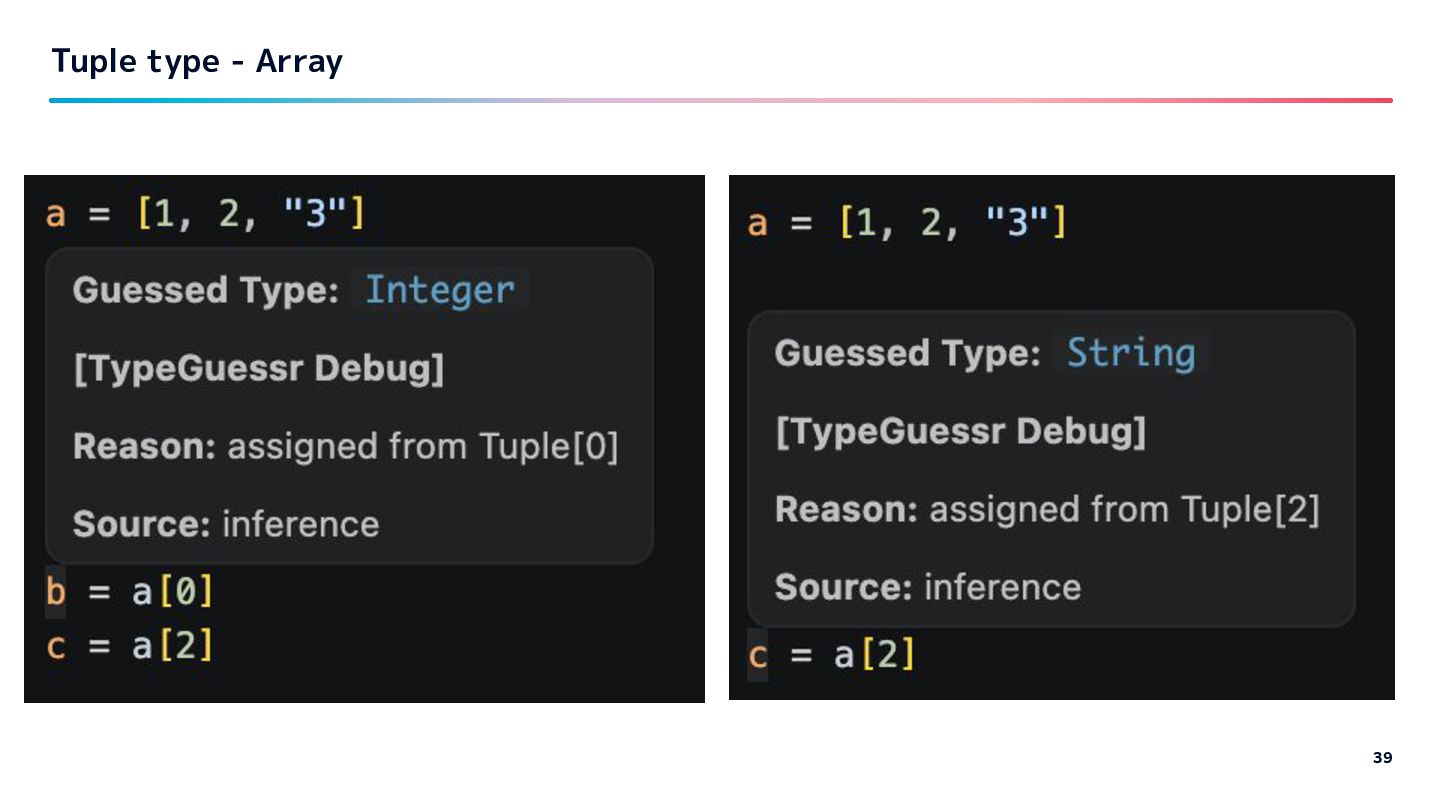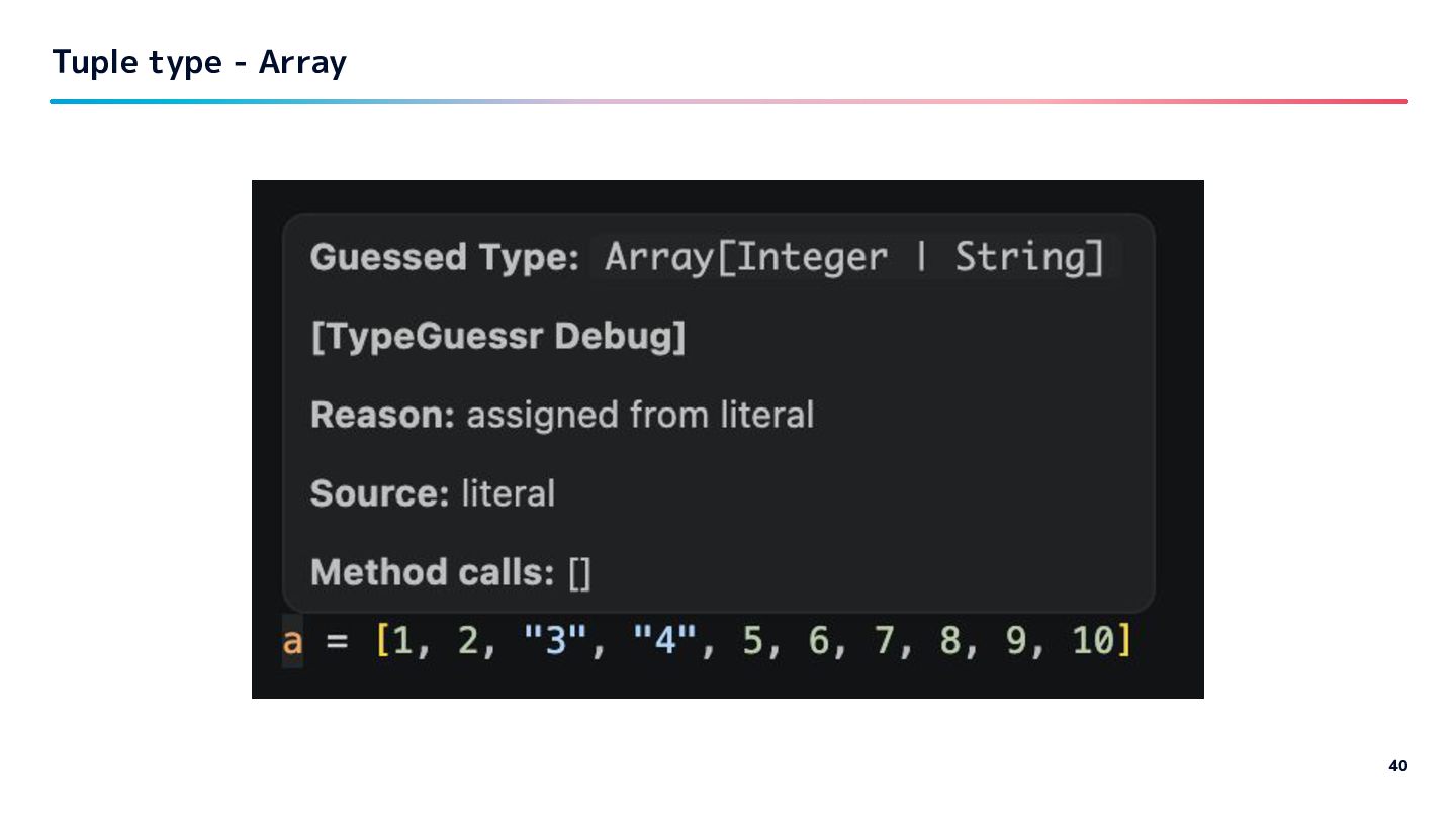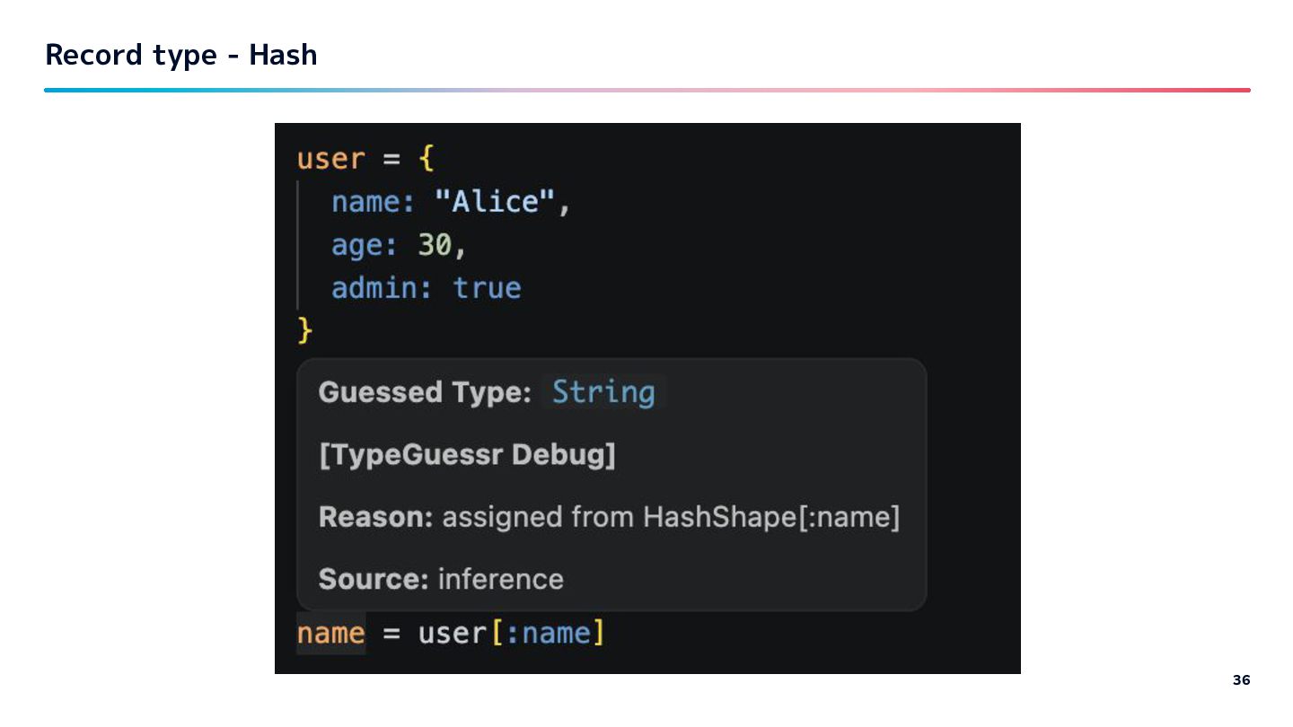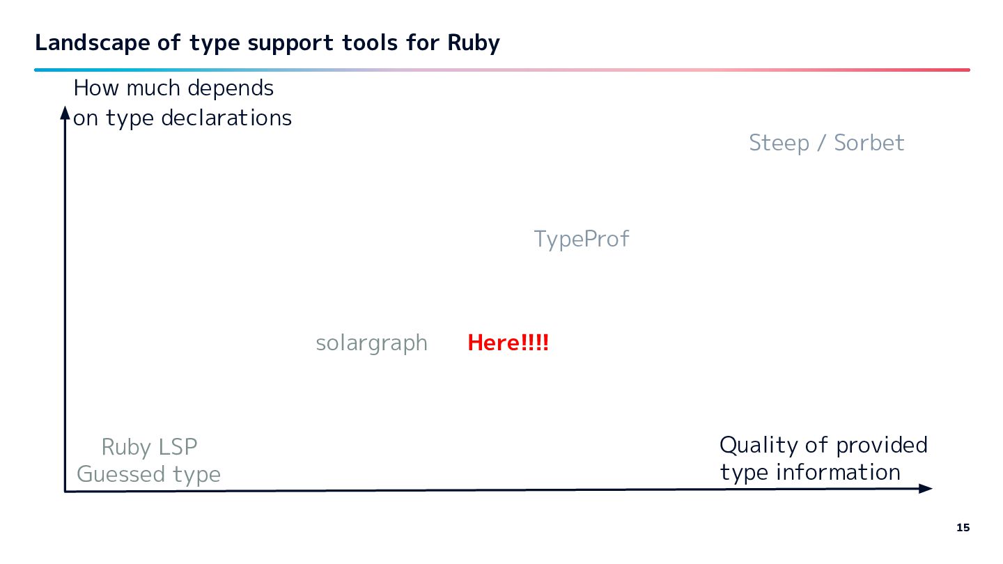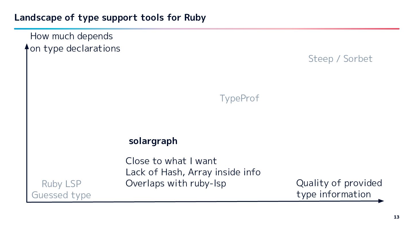 Guessed type TypeProf solargraph Close to what I want Lack of Hash, Array inside info Overlaps with ruby-lsp Steep / Sorbet How much depends on type declarations Quality of provided type information