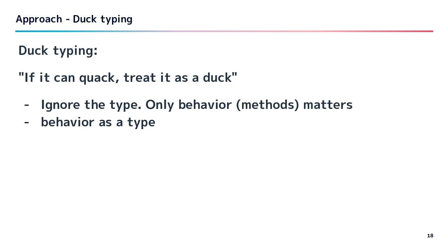 duck" - Ignore the type. Only behavior (methods) matters - behavior as a type Approach - Duck typing 18