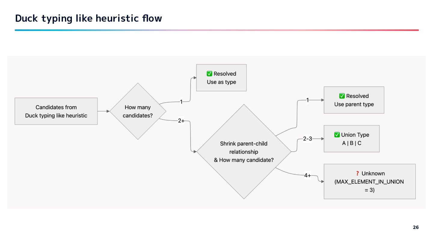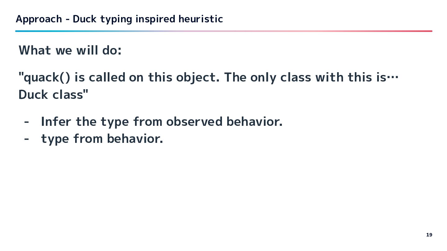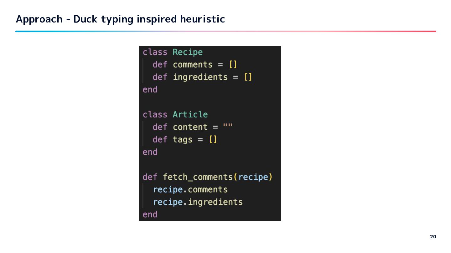 The only class with this is… Duck class" - Infer the type from observed behavior. - type from behavior. Approach - Duck typing inspired heuristic 19