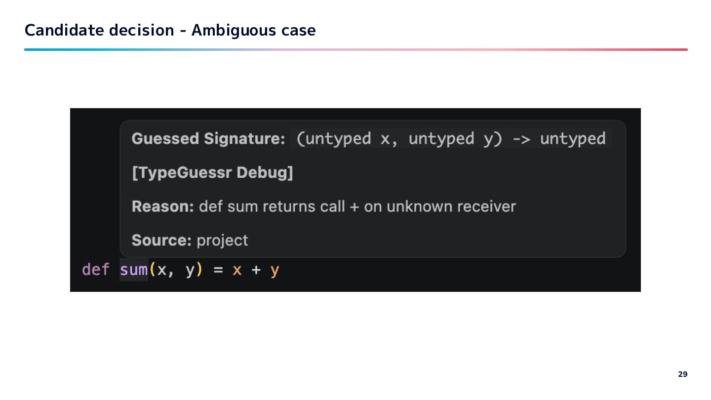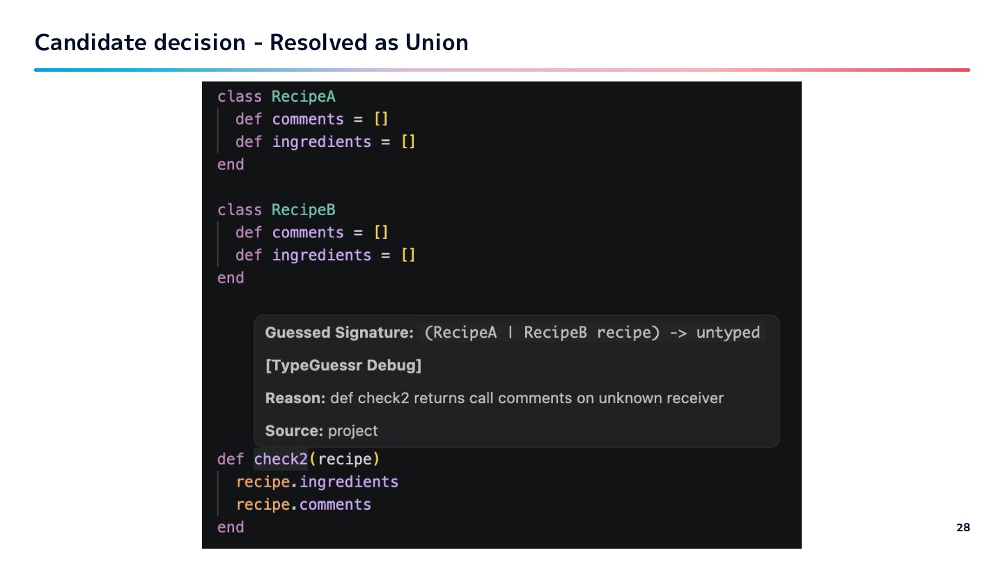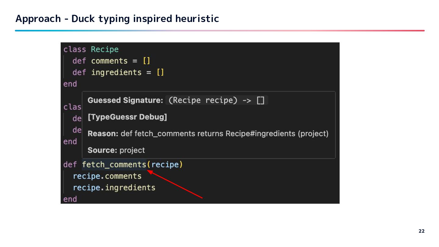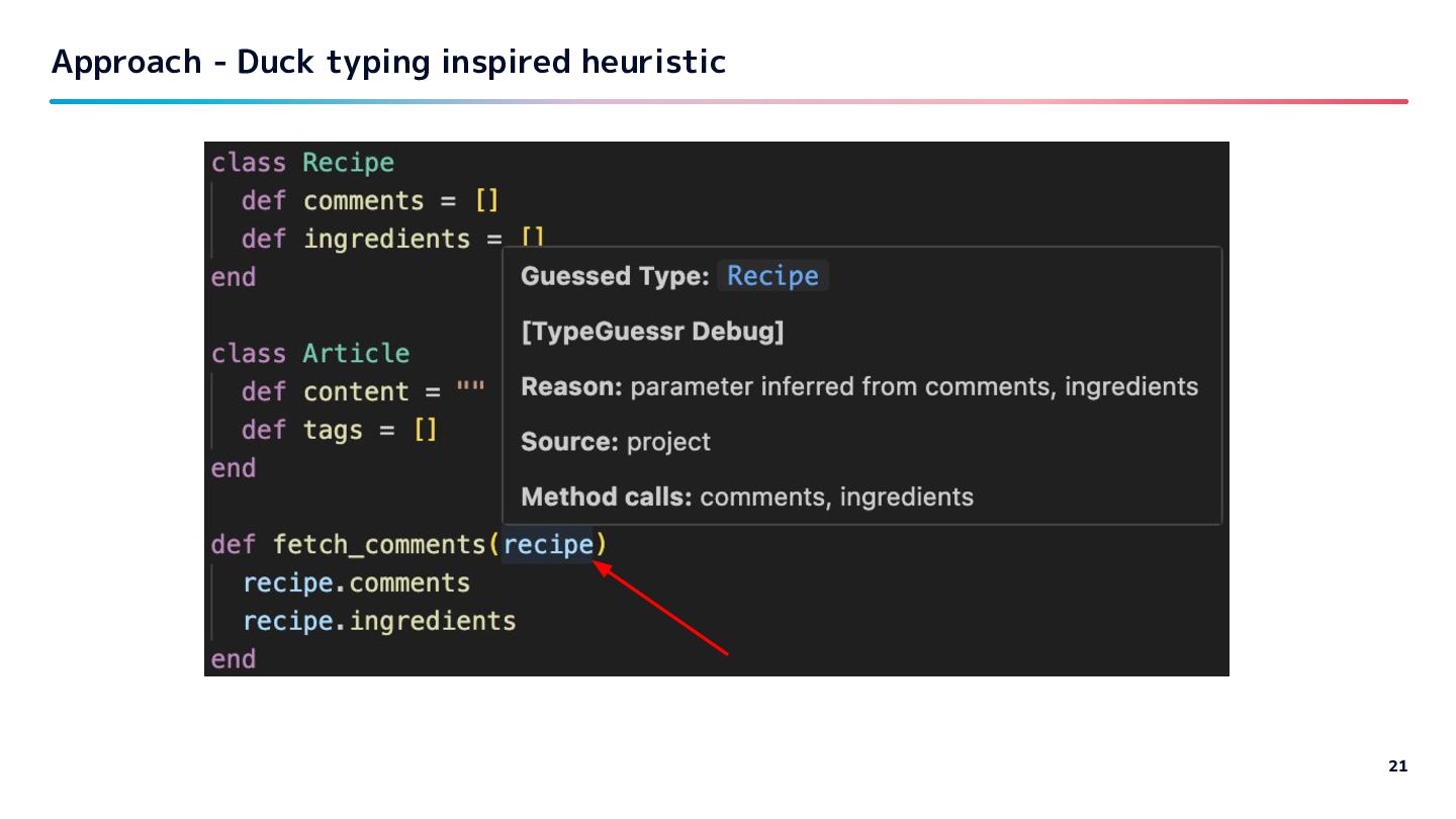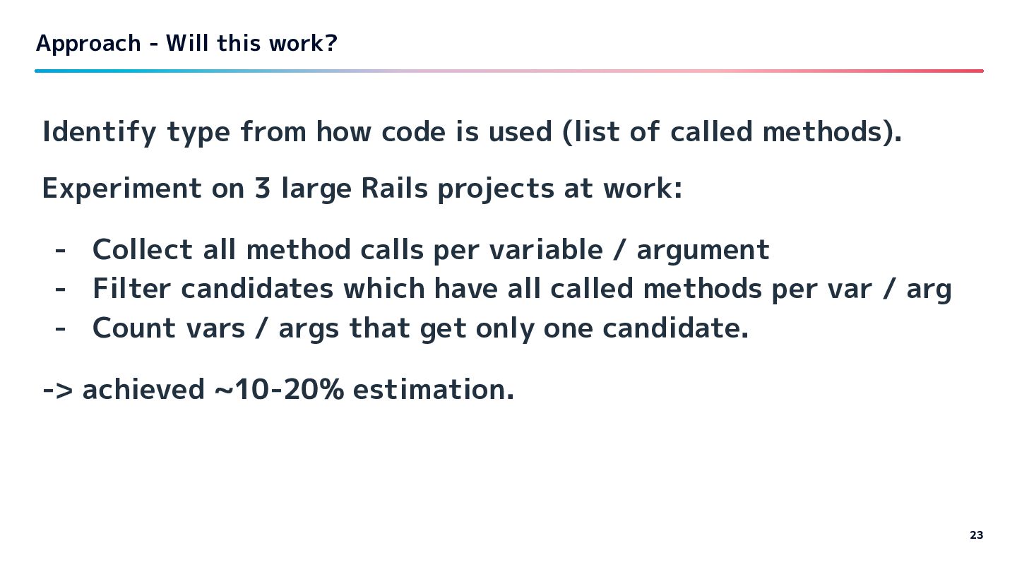 code is used (list of called methods). Experiment on 3 large Rails projects at work: - Collect all method calls per variable / argument - Filter candidates which have all called methods per var / arg - Count vars / args that get only one candidate. -> achieved ~10-20% estimation.