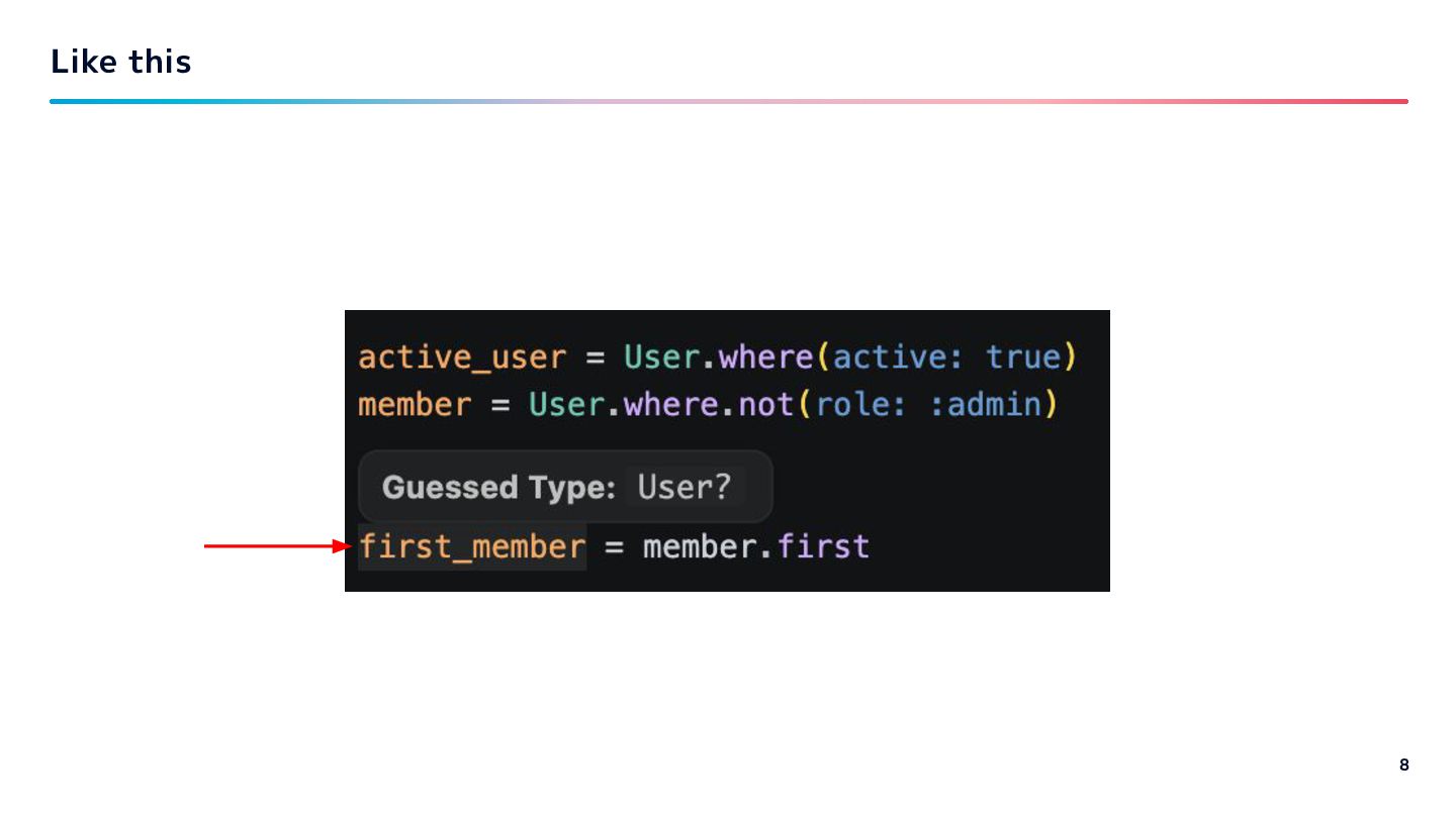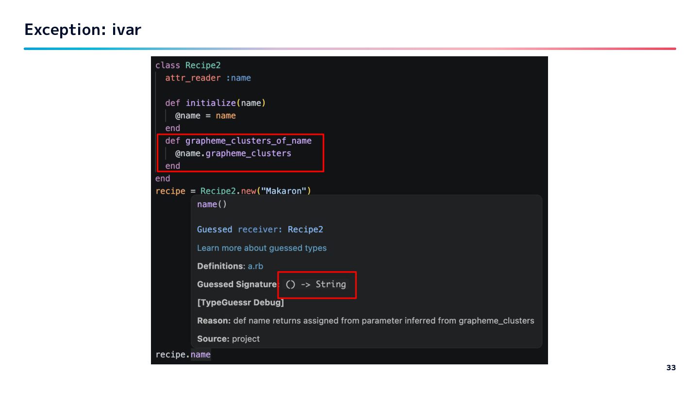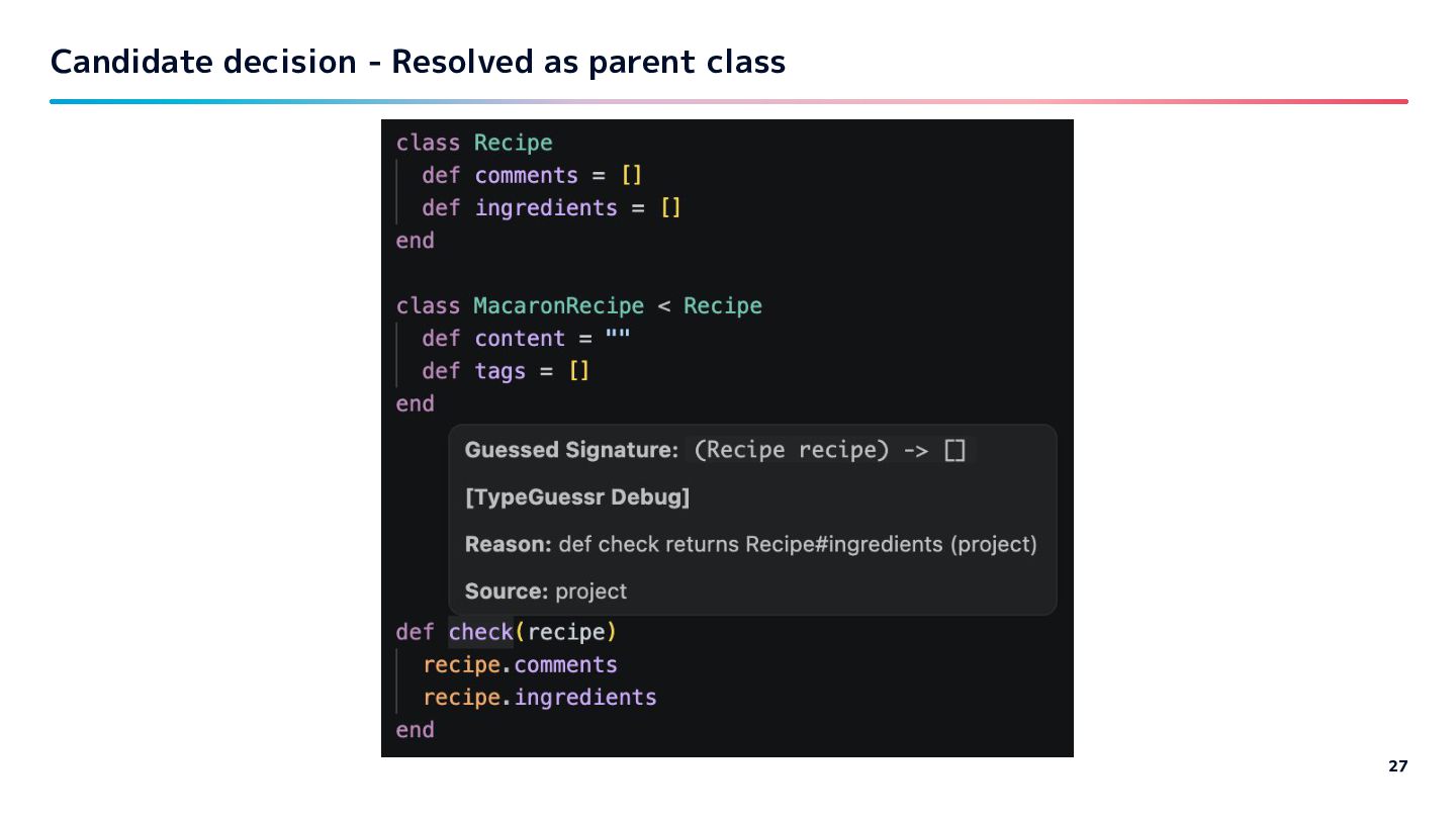 Guessed type TypeProf solargraph Support simple inference like: var name “user” to “User” class Steep / Sorbet How much depends on type declarations Quality of provided type information