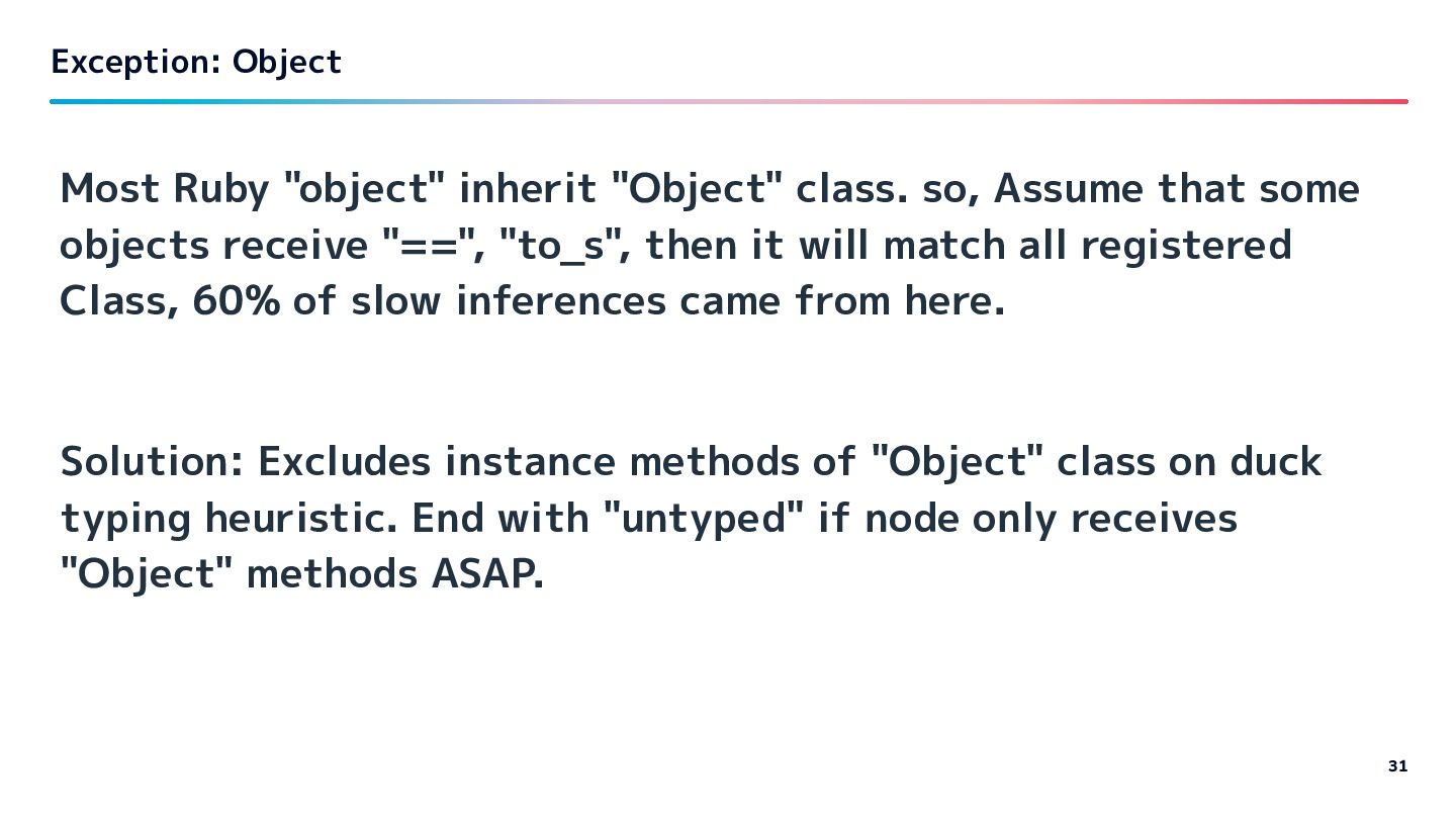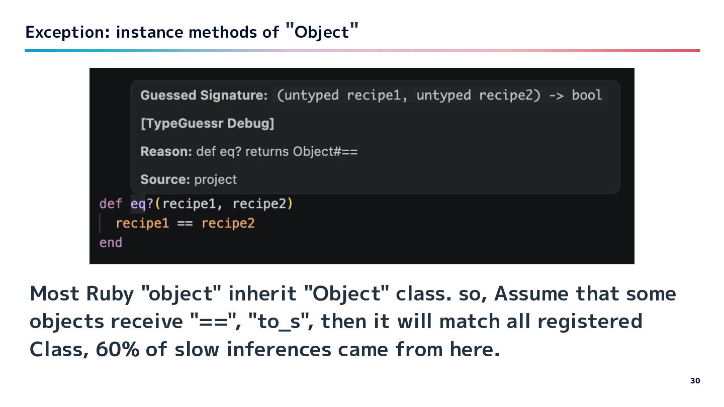 objects receive "==", "to_s", then it will match all registered Class, 60% of slow inferences came from here. Exception: instance methods of "Object" 30