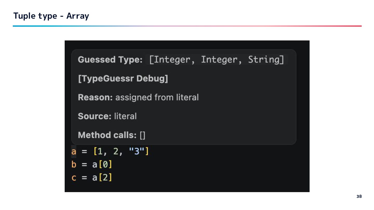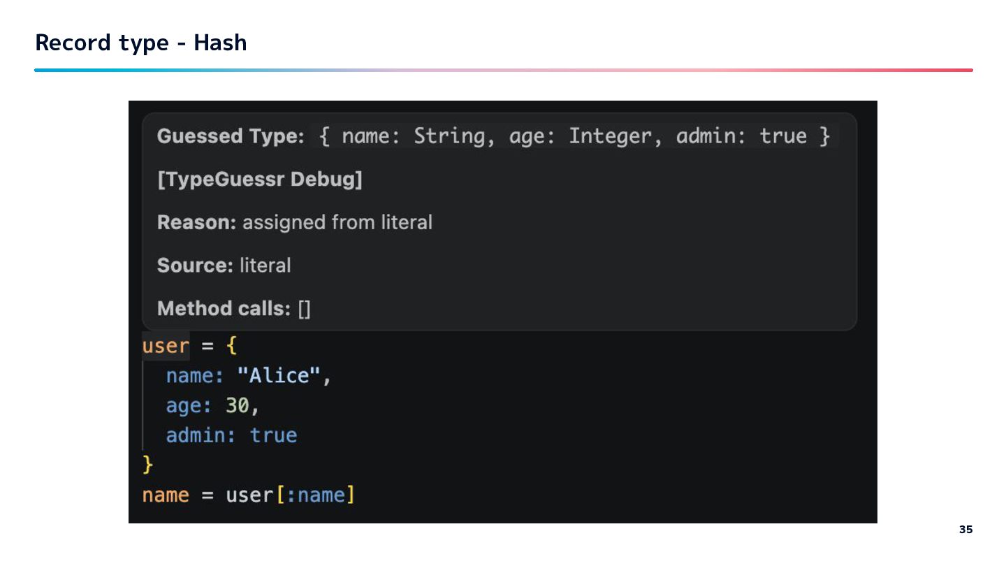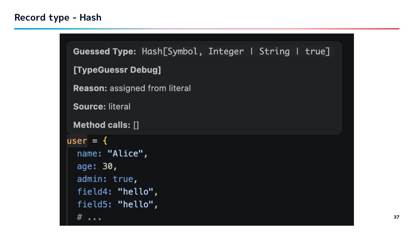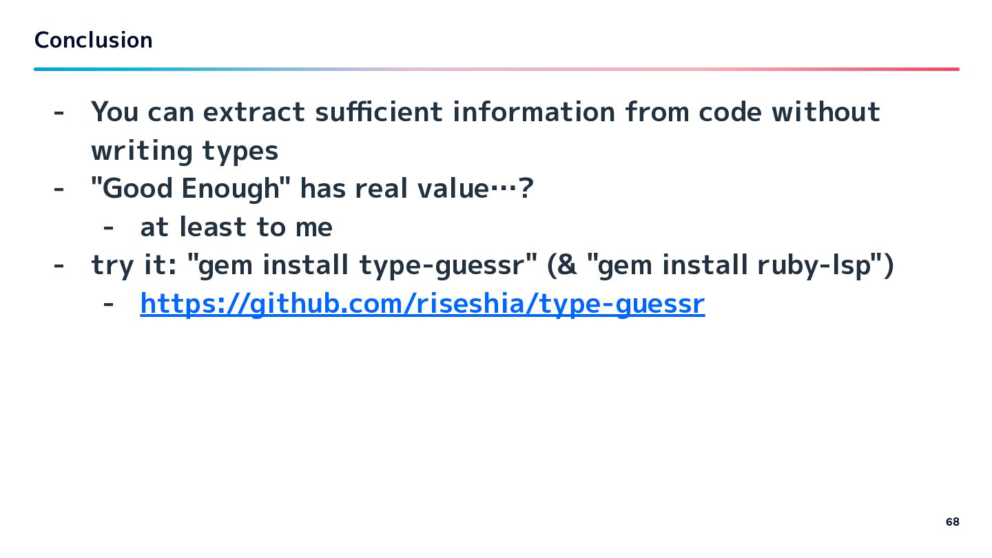 types - "Good Enough" has real value…? - at least to me - try it: "gem install type-guessr" (& "gem install ruby-lsp") - https://github.com/riseshia/type-guessr Conclusion 68