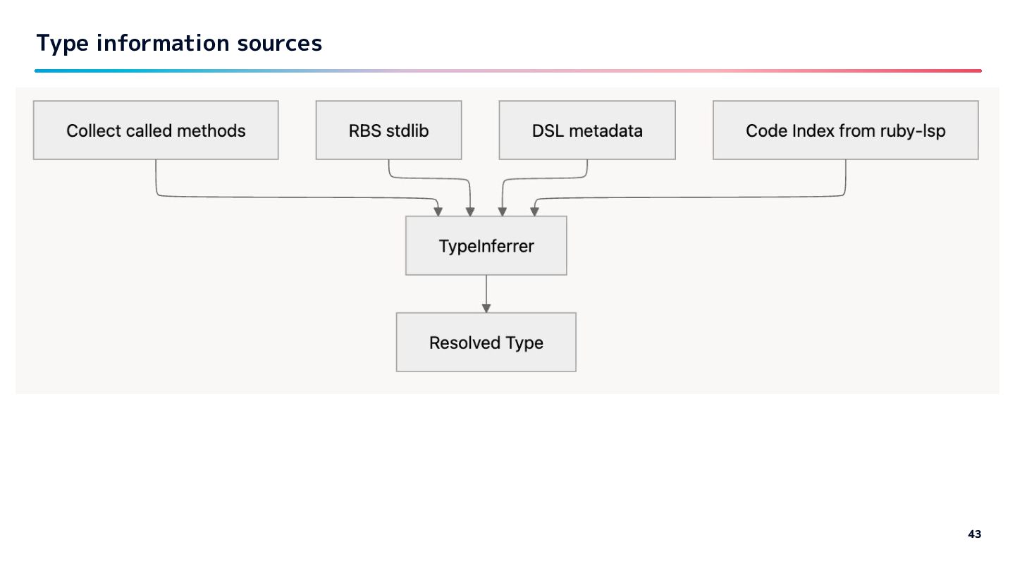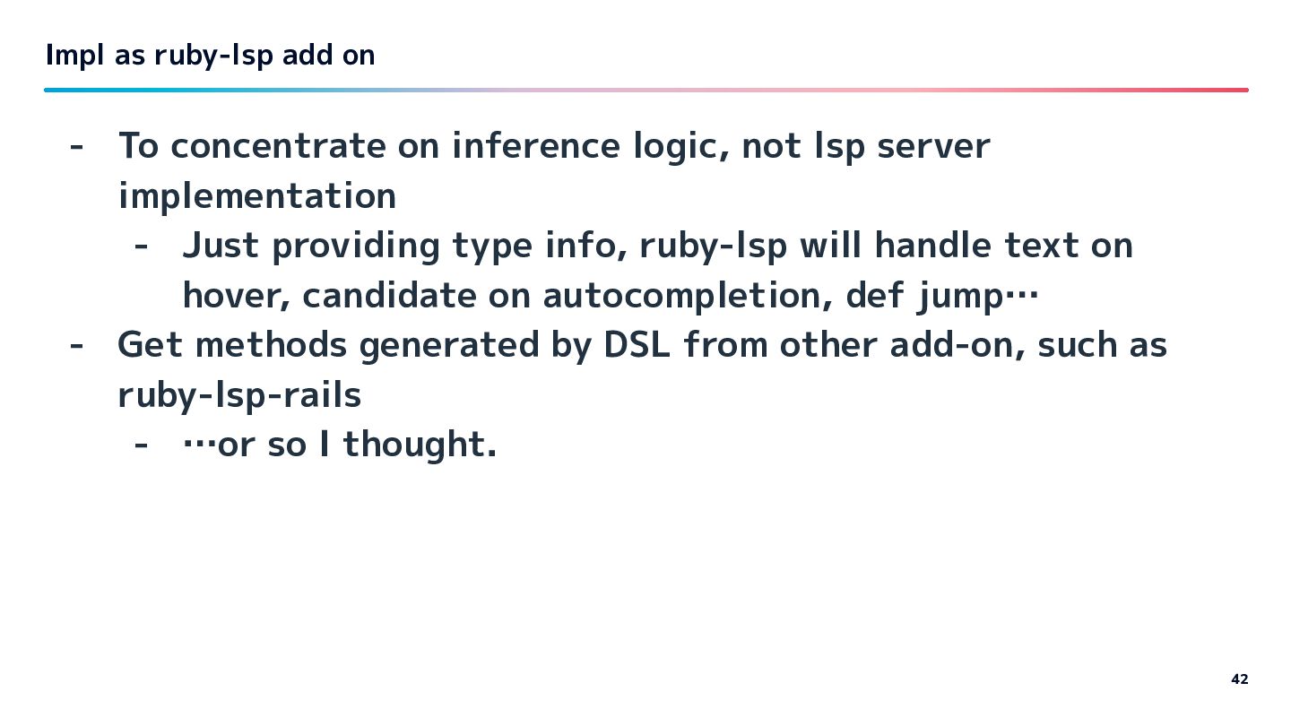 - Just providing type info, ruby-lsp will handle text on hover, candidate on autocompletion, def jump… - Get methods generated by DSL from other add-on, such as ruby-lsp-rails - …or so I thought. Impl as ruby-lsp add on 42