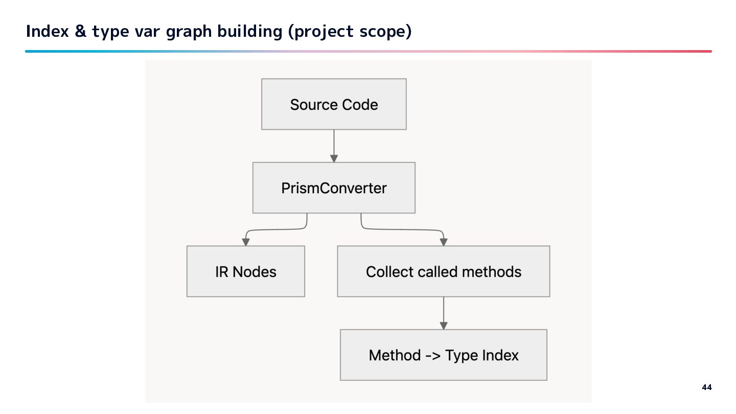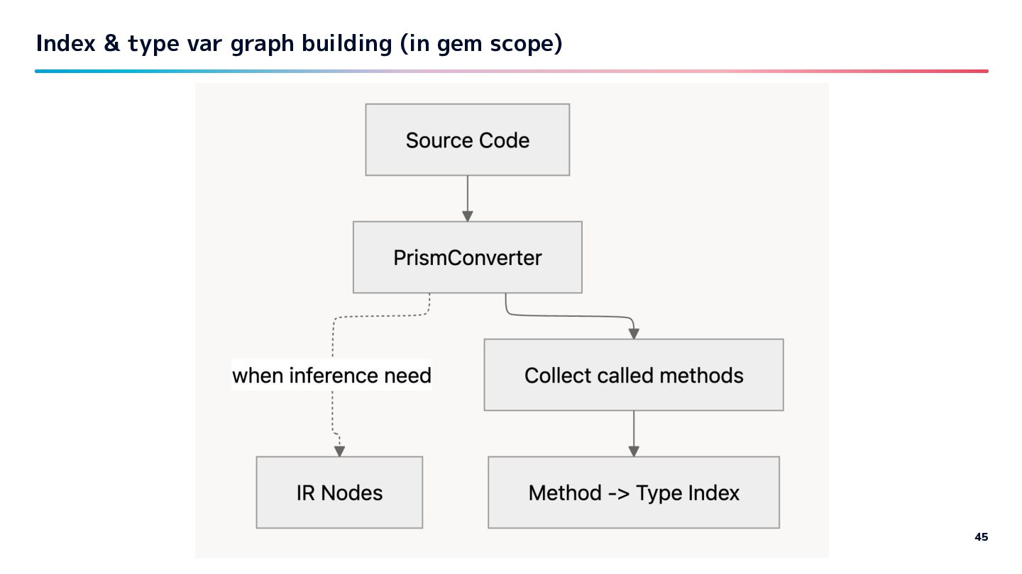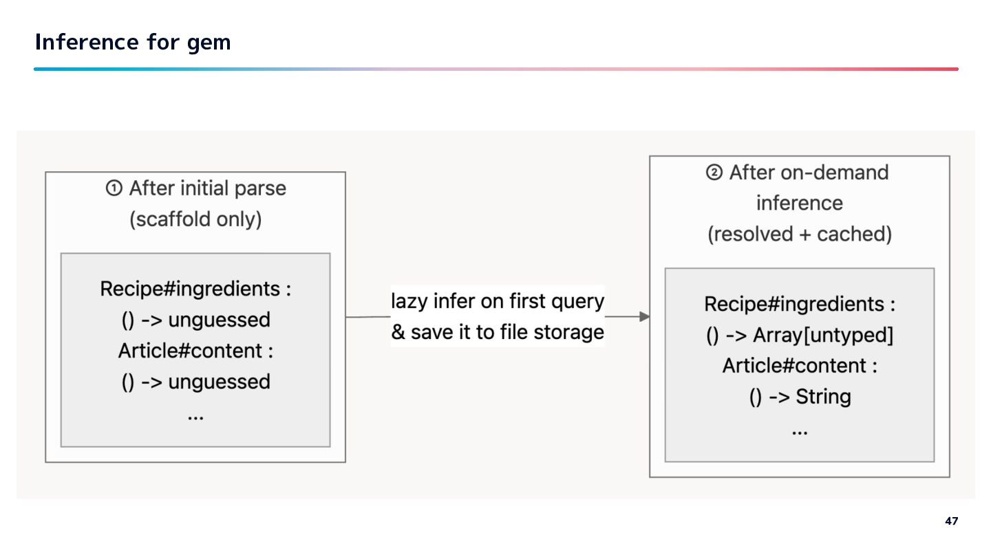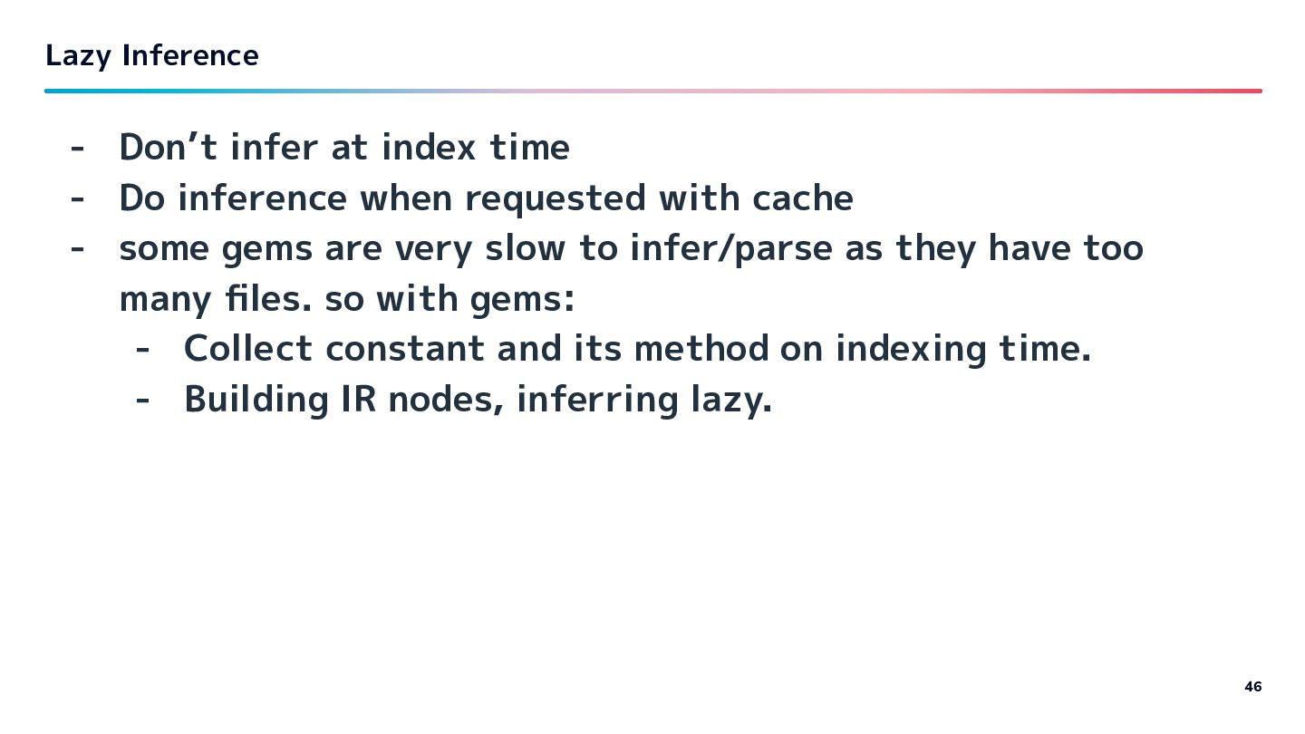 requested with cache - some gems are very slow to infer/parse as they have too many files. so with gems: - Collect constant and its method on indexing time. - Building IR nodes, inferring lazy. Lazy Inference 46