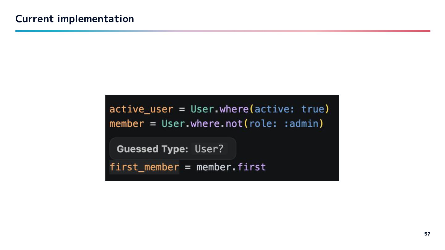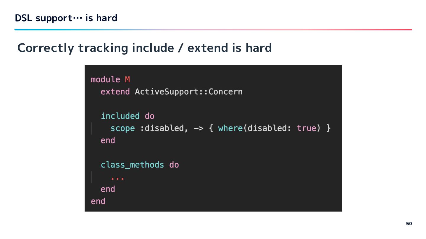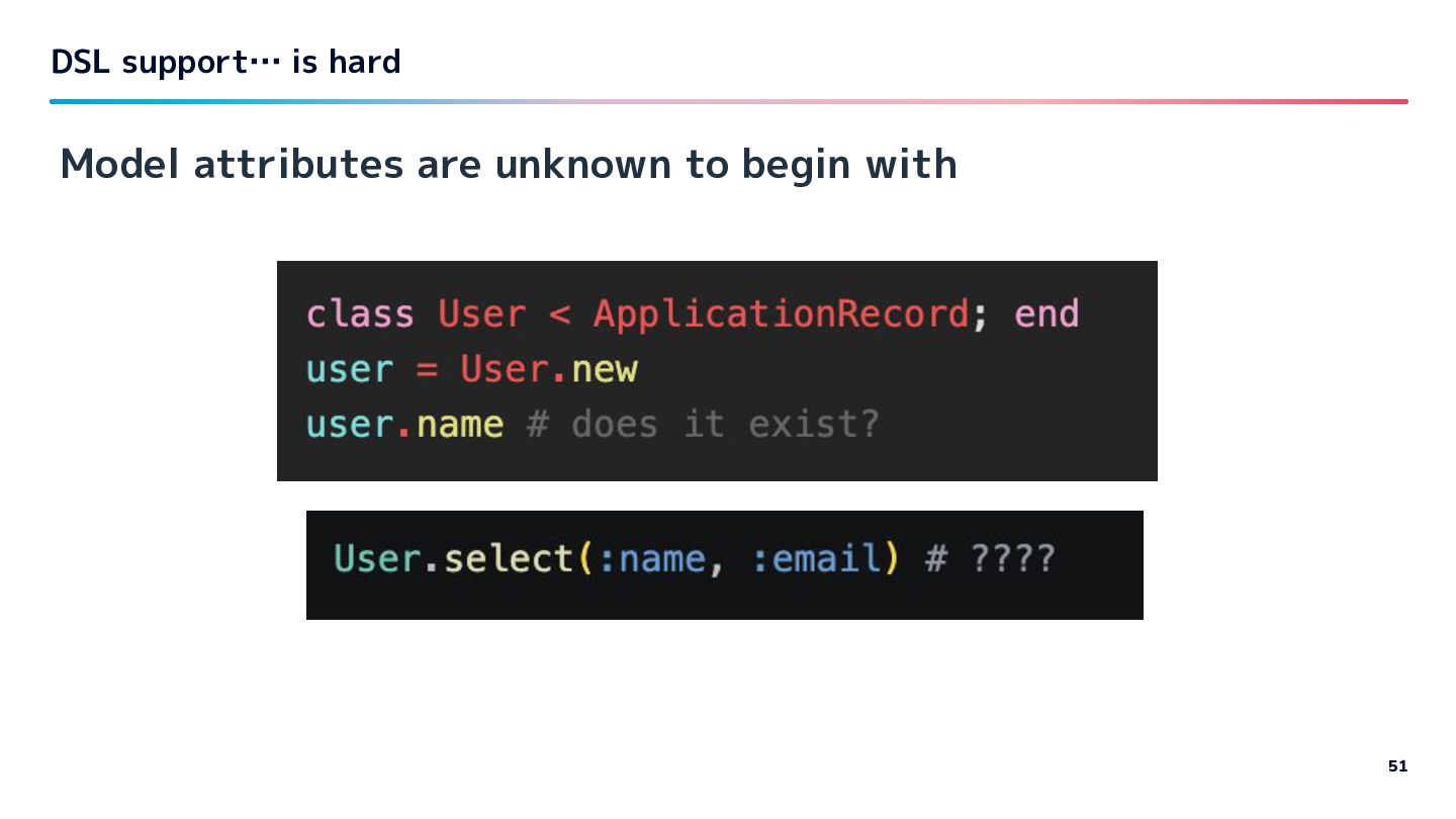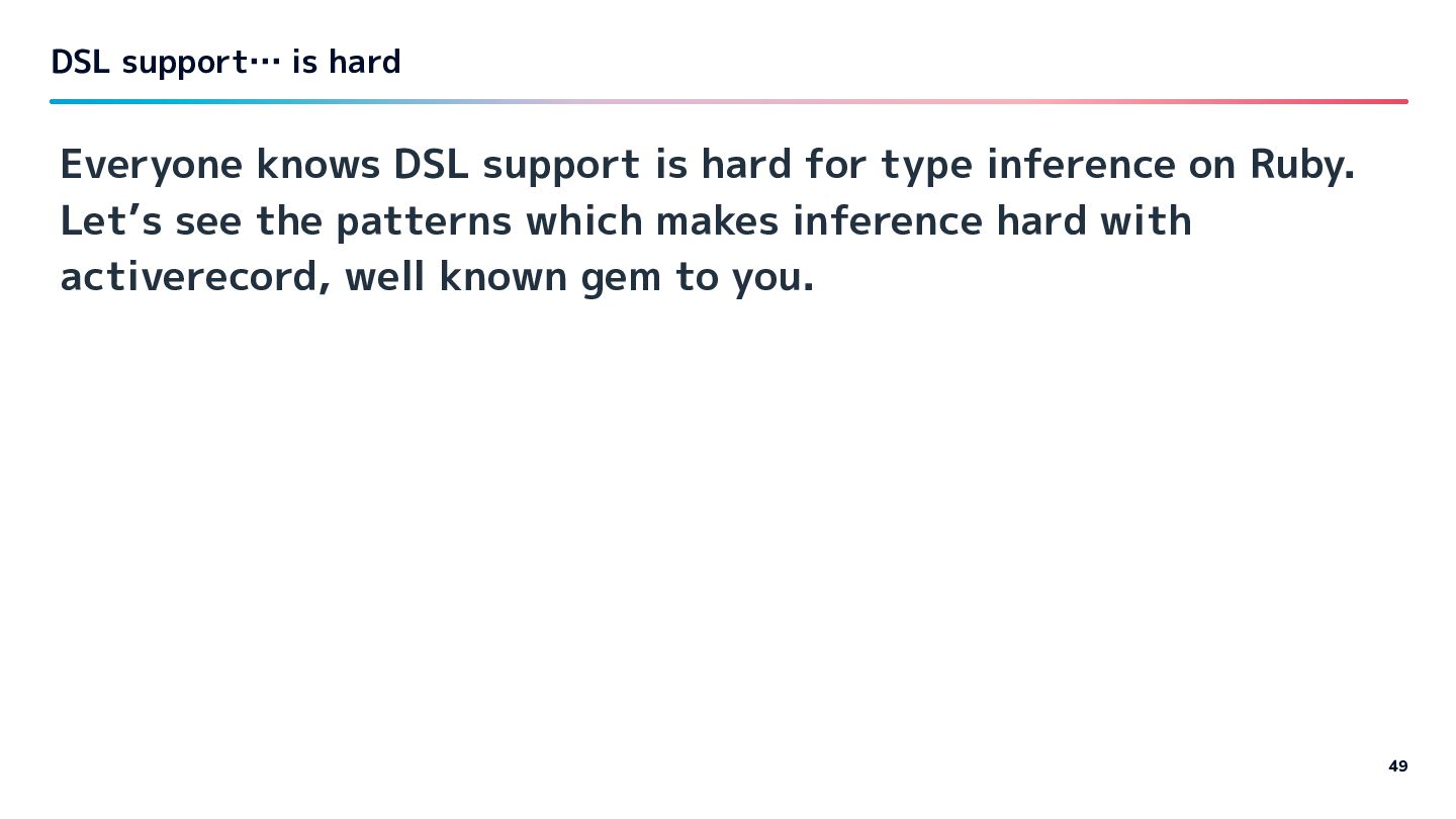 Ruby. Let’s see the patterns which makes inference hard with activerecord, well known gem to you. DSL support… is hard 49