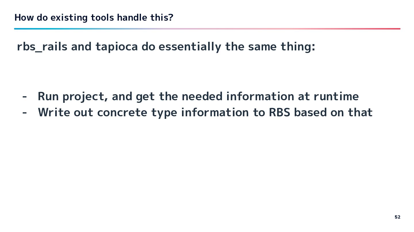 project, and get the needed information at runtime - Write out concrete type information to RBS based on that How do existing tools handle this? 52