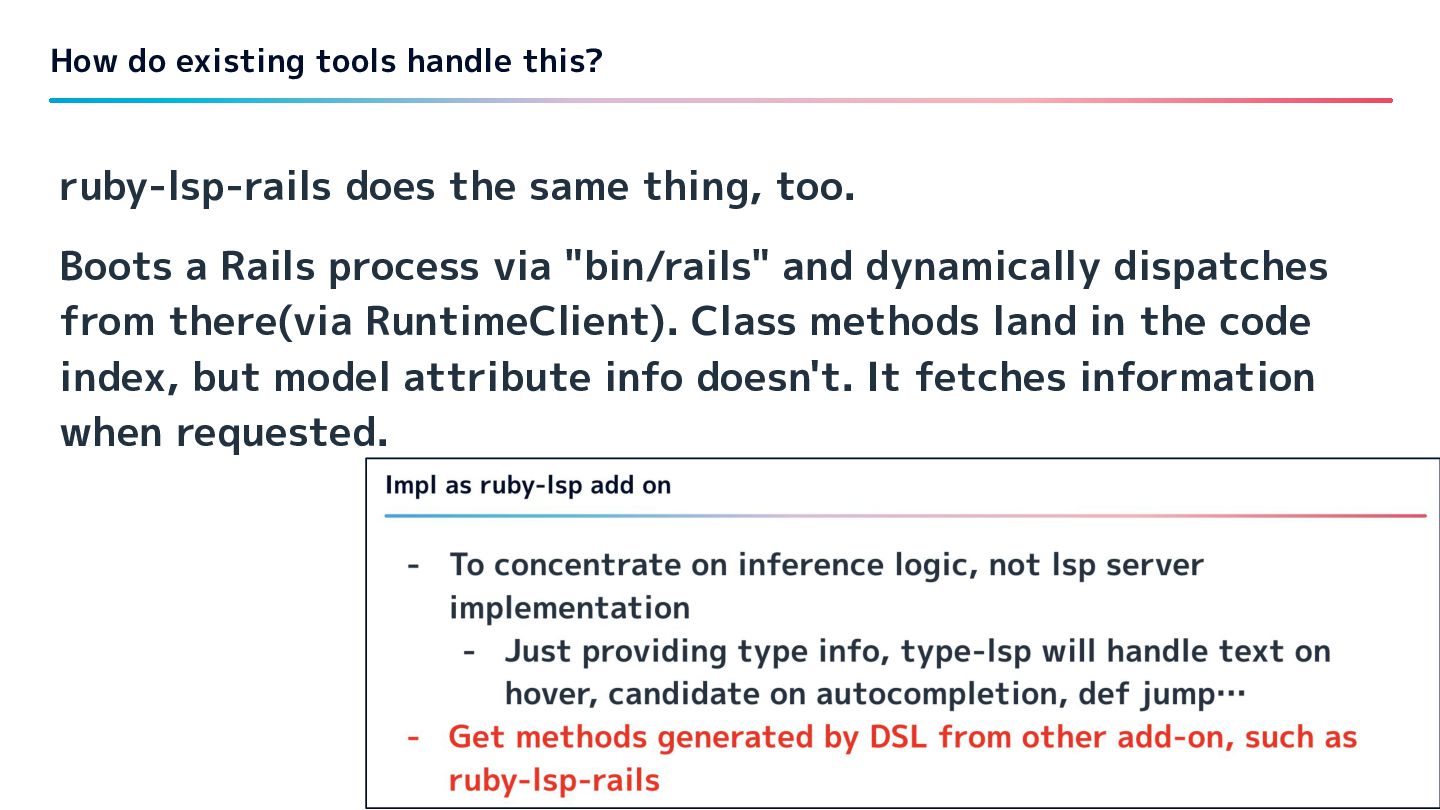 via "bin/rails" and dynamically dispatches from there(via RuntimeClient). Class methods land in the code index, but model attribute info doesn't. It fetches information when requested. How do existing tools handle this? 53
