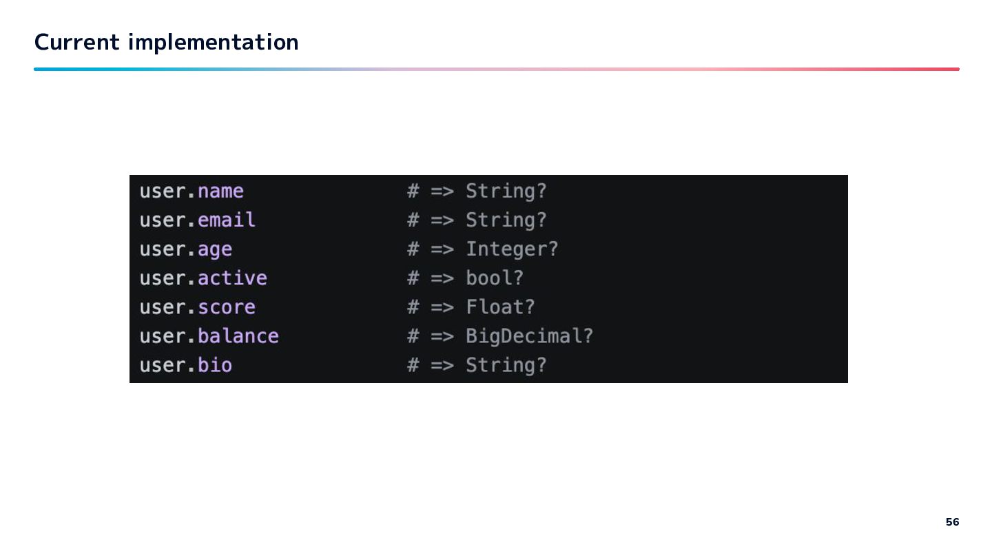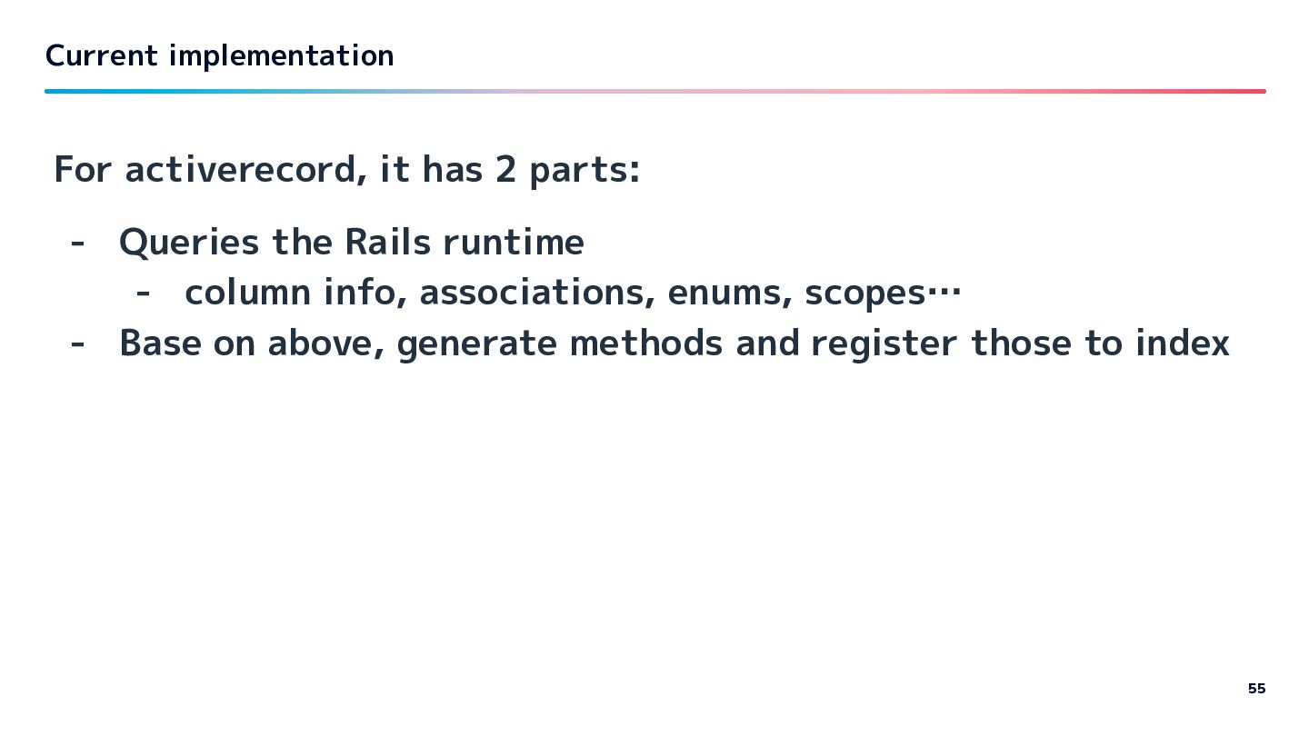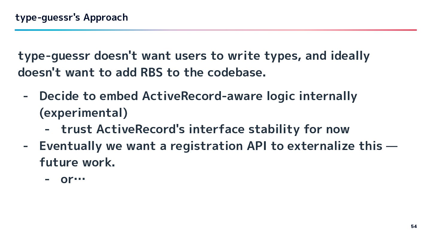 ideally doesn't want to add RBS to the codebase. - Decide to embed ActiveRecord-aware logic internally (experimental) - trust ActiveRecord's interface stability for now - Eventually we want a registration API to externalize this — future work. - or… 54