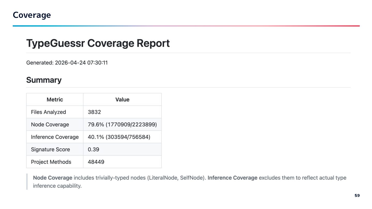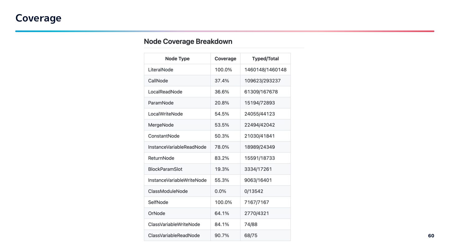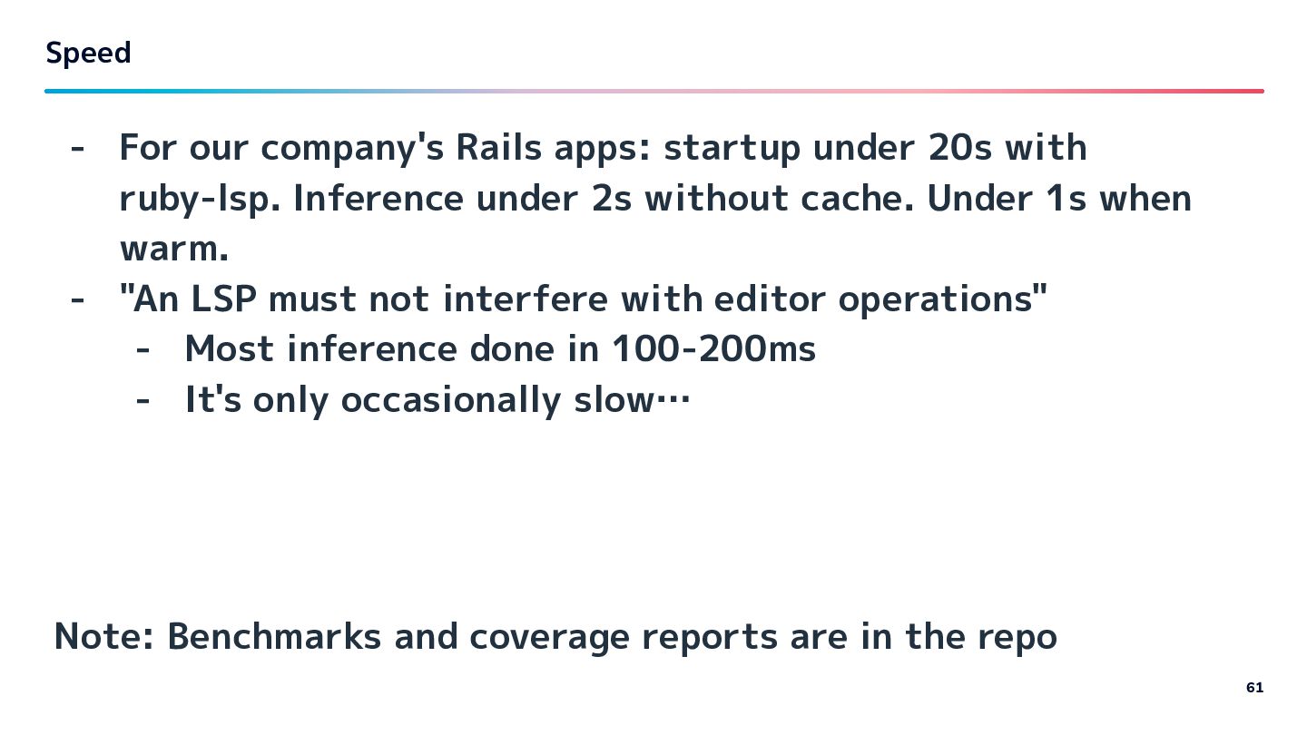 20s with ruby-lsp. Inference under 2s without cache. Under 1s when warm. - "An LSP must not interfere with editor operations" - Most inference done in 100-200ms - It's only occasionally slow… Note: Benchmarks and coverage reports are in the repo
