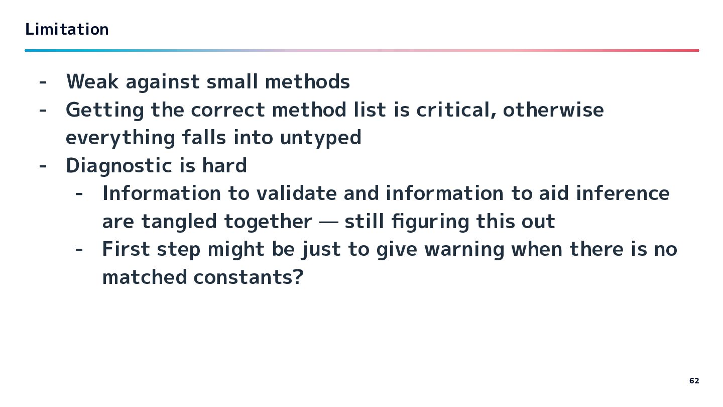 list is critical, otherwise everything falls into untyped - Diagnostic is hard - Information to validate and information to aid inference are tangled together — still figuring this out - First step might be just to give warning when there is no matched constants? Limitation 62