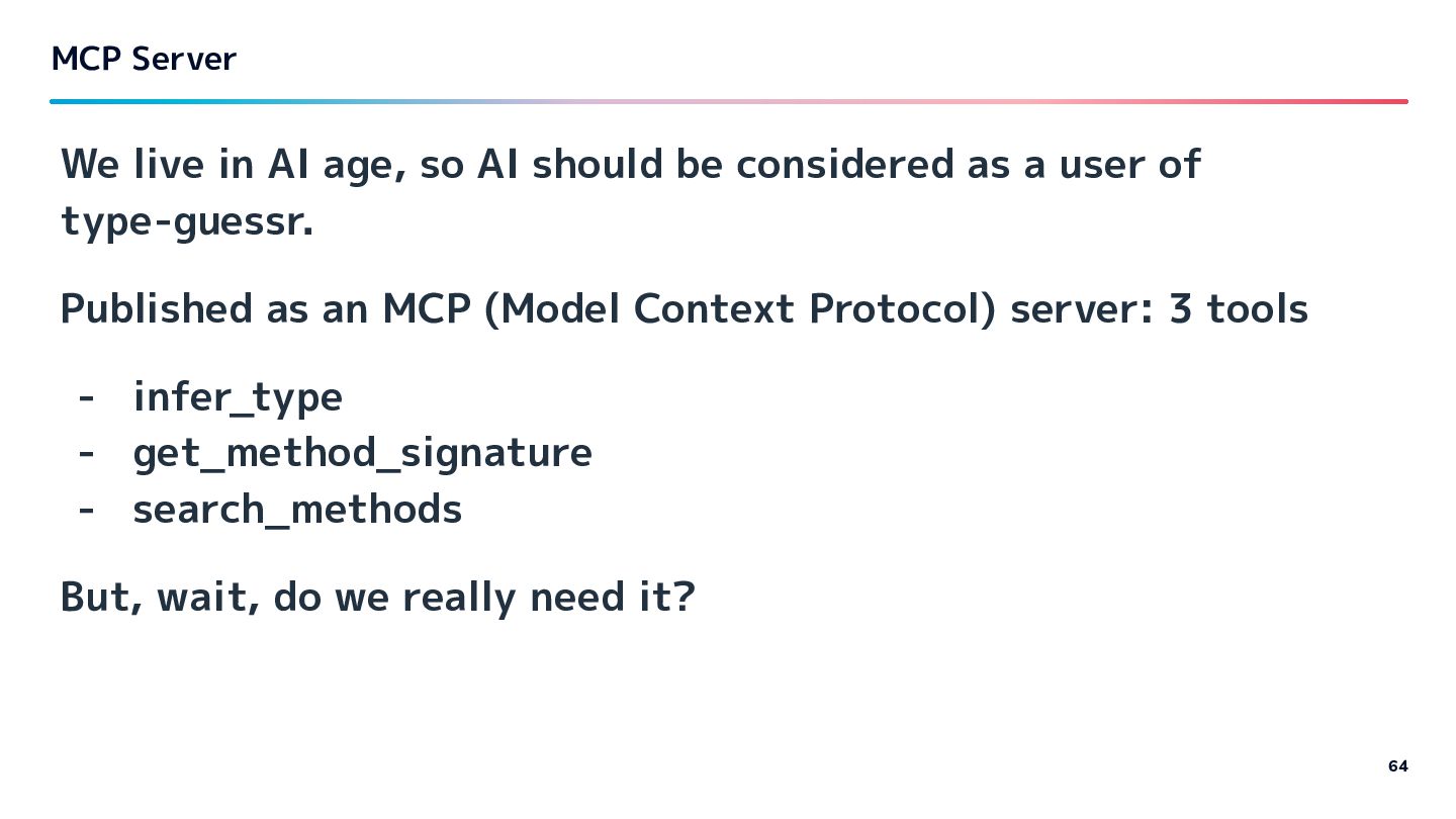 be considered as a user of type-guessr. Published as an MCP (Model Context Protocol) server: 3 tools - infer_type - get_method_signature - search_methods But, wait, do we really need it? 64