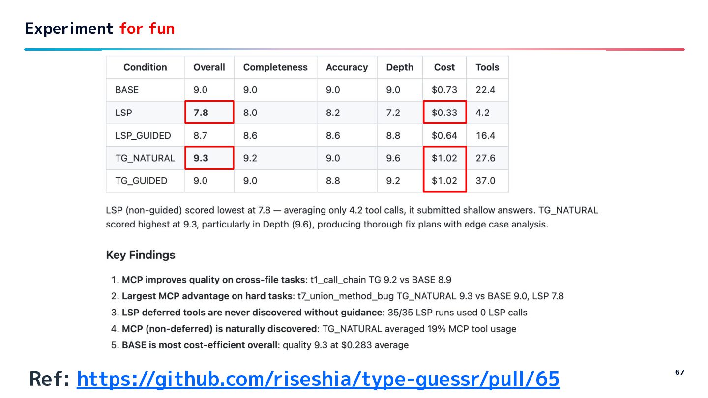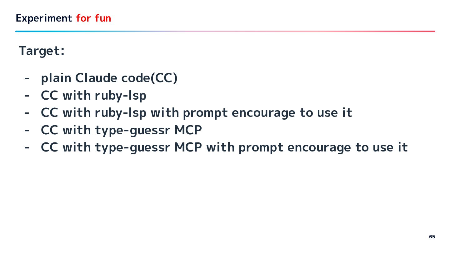 CC with ruby-lsp with prompt encourage to use it - CC with type-guessr MCP - CC with type-guessr MCP with prompt encourage to use it Experiment for fun 65