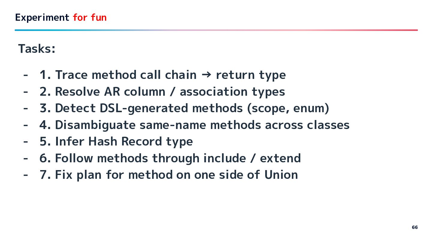 - 2. Resolve AR column / association types - 3. Detect DSL-generated methods (scope, enum) - 4. Disambiguate same-name methods across classes - 5. Infer Hash Record type - 6. Follow methods through include / extend - 7. Fix plan for method on one side of Union 66 Experiment for fun
