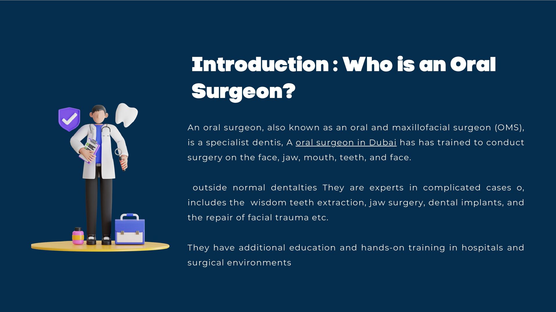 also known as an oral and maxillofacial surgeon (OMS), is a specialist dentis, A oral surgeon in Dubai has has trained to conduct surgery on the face, jaw, mouth, teeth, and face. outside normal dentalties They are experts in complicated cases o, includes the wisdom teeth extraction, jaw surgery, dental implants, and the repair of facial trauma etc. They have additional education and hands-on training in hospitals and surgical environments