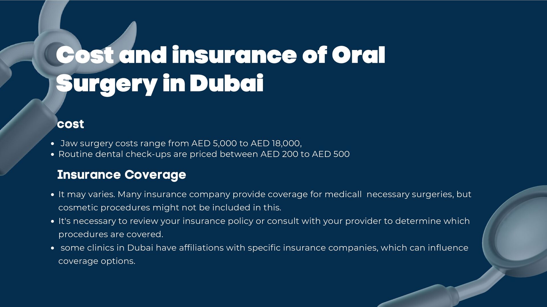 Coverage Jaw surgery costs range from AED 5,000 to AED 18,000, Routine dental check-ups are priced between AED 200 to AED 500 It may varies. Many insurance company provide coverage for medicall necessary surgeries, but cosmetic procedures might not be included in this. It's necessary to review your insurance policy or consult with your provider to determine which procedures are covered. some clinics in Dubai have affiliations with specific insurance companies, which can influence coverage options.