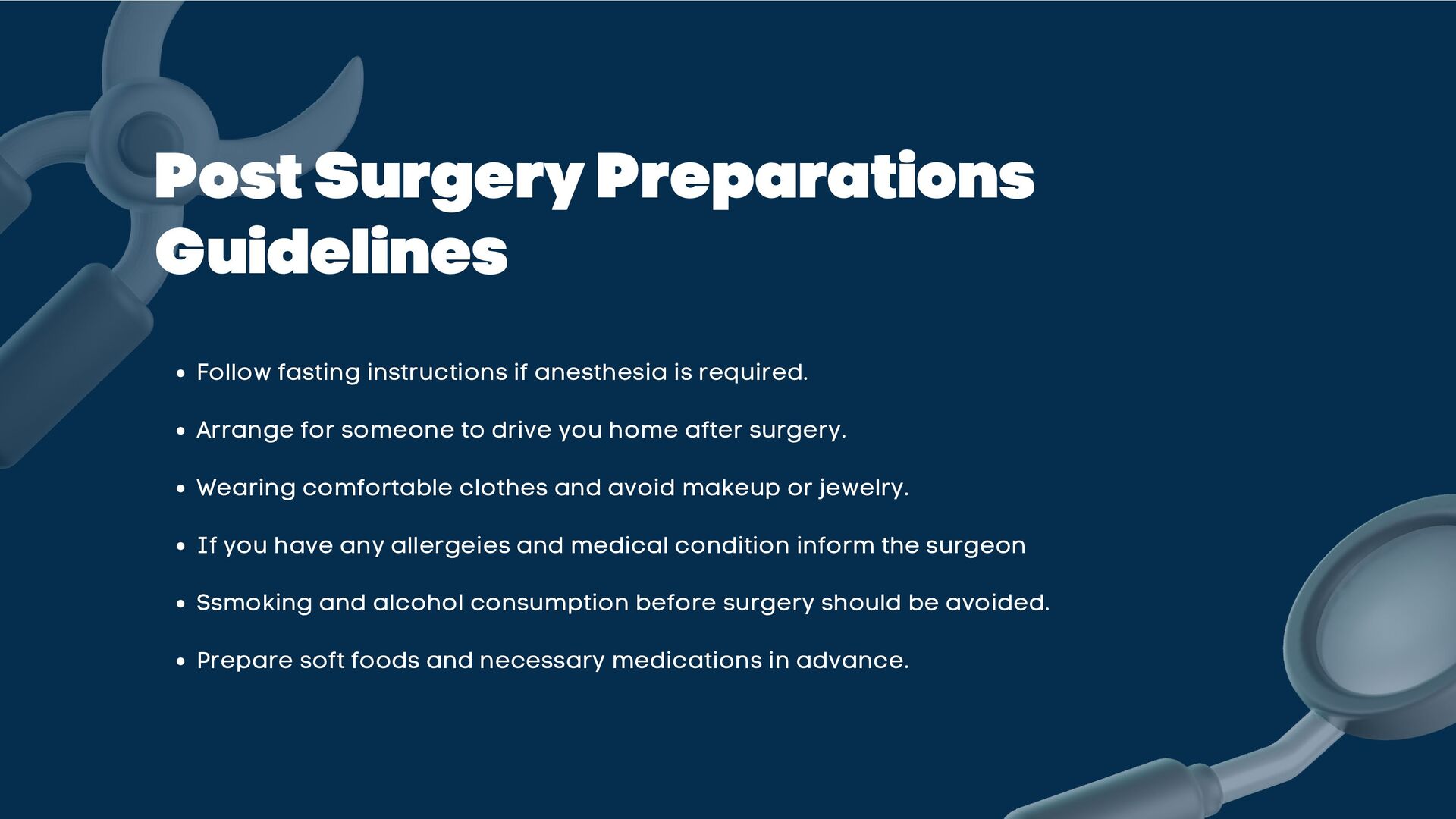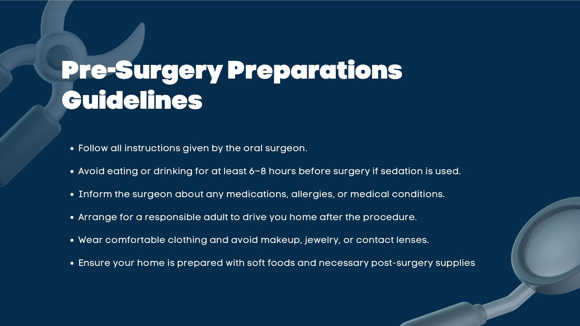 surgeon. Avoid eating or drinking for at least 6–8 hours before surgery if sedation is used. Inform the surgeon about any medications, allergies, or medical conditions. Arrange for a responsible adult to drive you home after the procedure. Wear comfortable clothing and avoid makeup, jewelry, or contact lenses. Ensure your home is prepared with soft foods and necessary post-surgery supplies