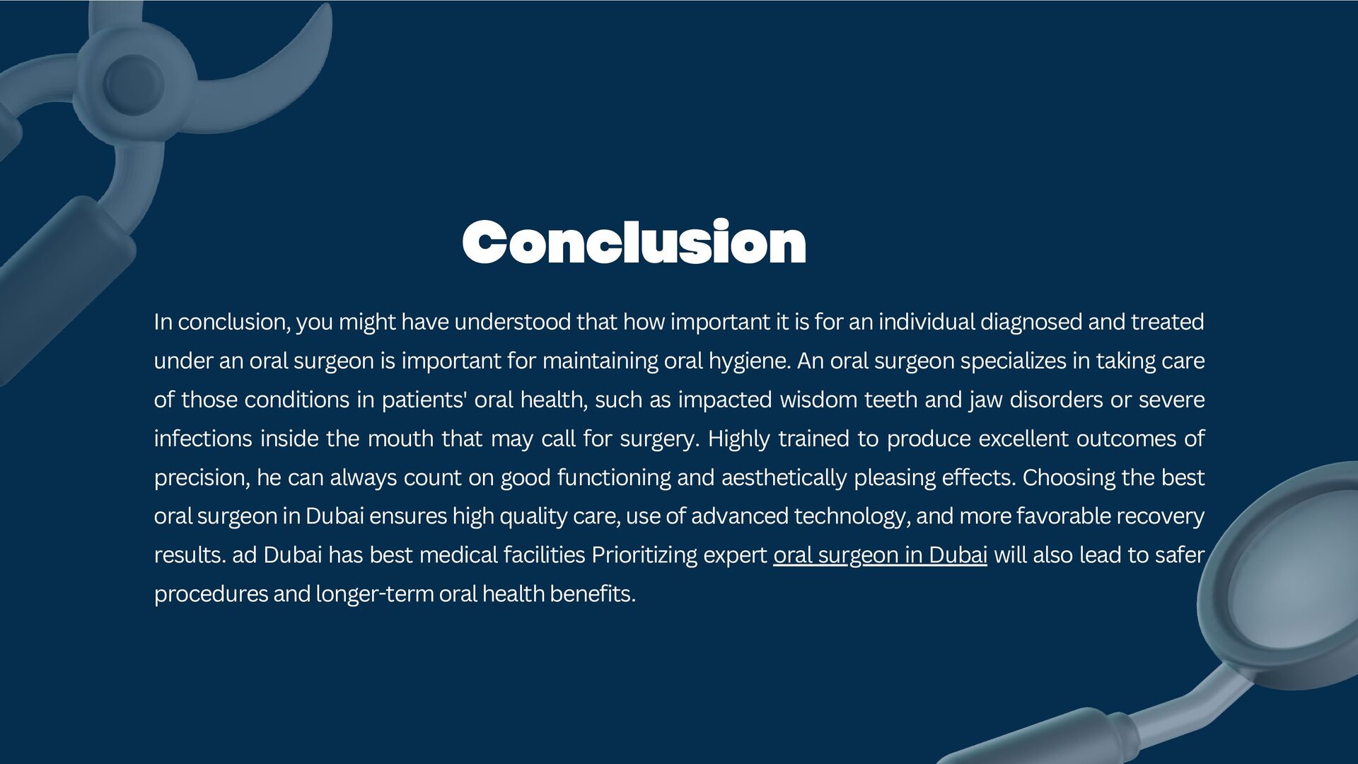 it is for an individual diagnosed and treated under an oral surgeon is important for maintaining oral hygiene. An oral surgeon specializes in taking care of those conditions in patients' oral health, such as impacted wisdom teeth and jaw disorders or severe infections inside the mouth that may call for surgery. Highly trained to produce excellent outcomes of precision, he can always count on good functioning and aesthetically pleasing effects. Choosing the best oral surgeon in Dubai ensures high quality care, use of advanced technology, and more favorable recovery results. ad Dubai has best medical facilities Prioritizing expert oral surgeon in Dubai will also lead to safer procedures and longer-term oral health benefits.