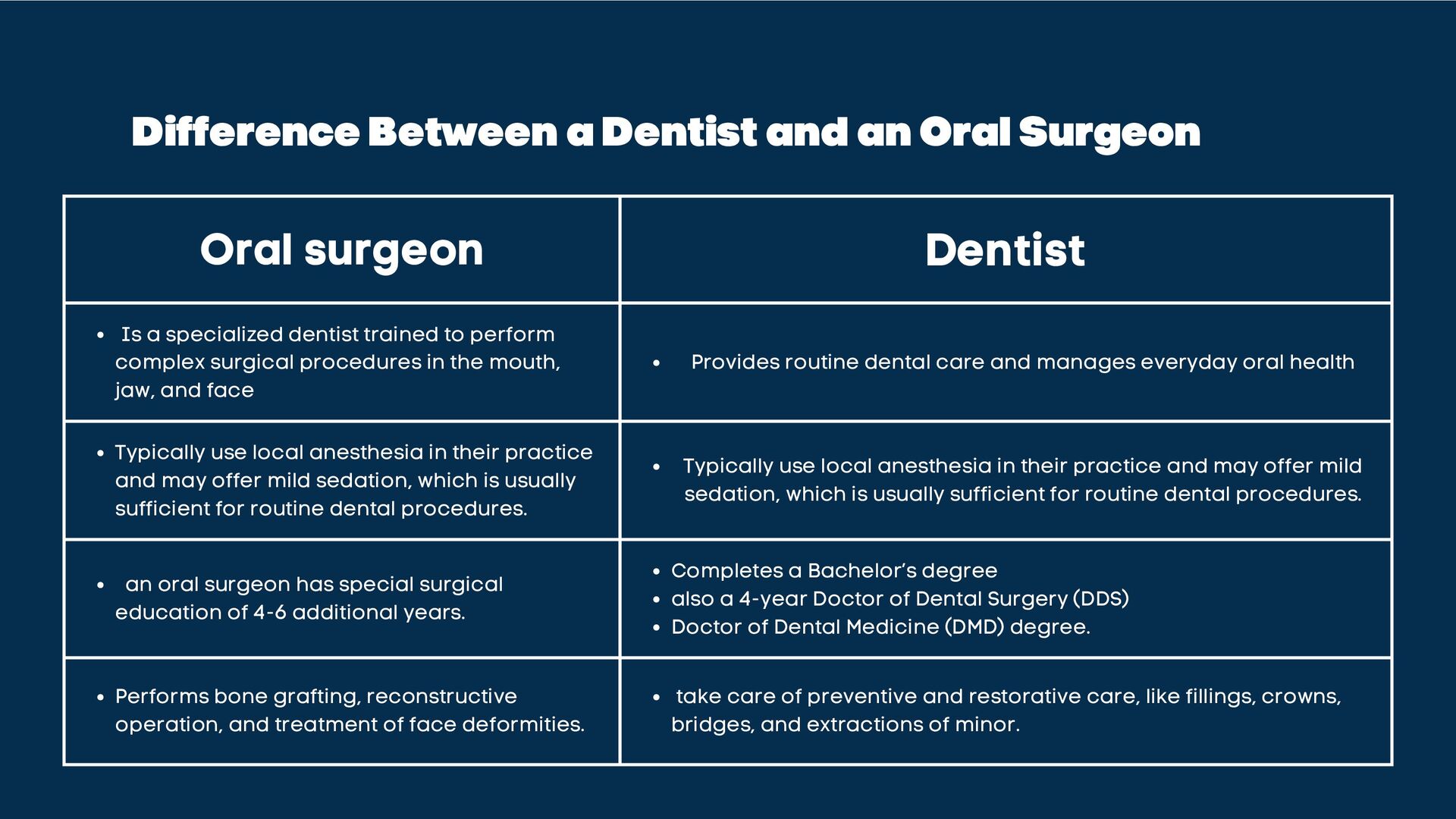 complex surgical procedures in the mouth, jaw, and face Provides routine dental care and manages everyday oral health Typically use local anesthesia in their practice and may offer mild sedation, which is usually sufficient for routine dental procedures. Typically use local anesthesia in their practice and may offer mild sedation, which is usually sufficient for routine dental procedures. an oral surgeon has special surgical education of 4-6 additional years. Completes a Bachelor’s degree also a 4-year Doctor of Dental Surgery (DDS) Doctor of Dental Medicine (DMD) degree. Performs bone grafting, reconstructive operation, and treatment of face deformities. take care of preventive and restorative care, like fillings, crowns, bridges, and extractions of minor. Difference Between a Dentist and an Oral Surgeon