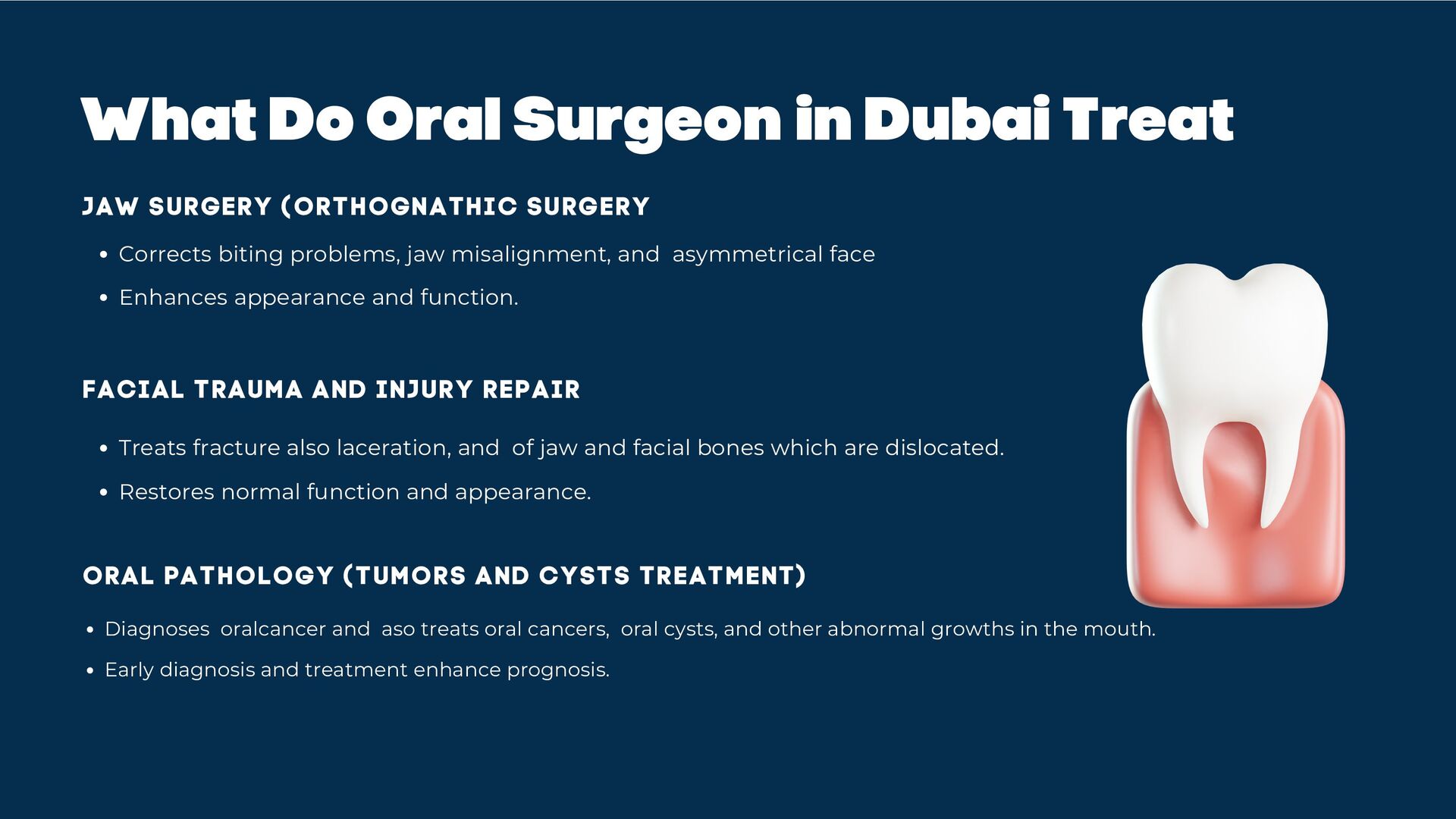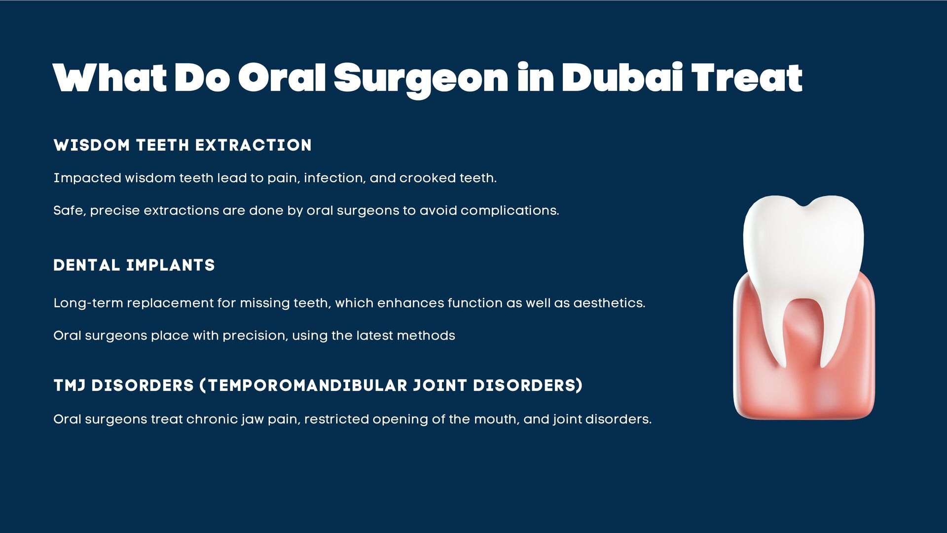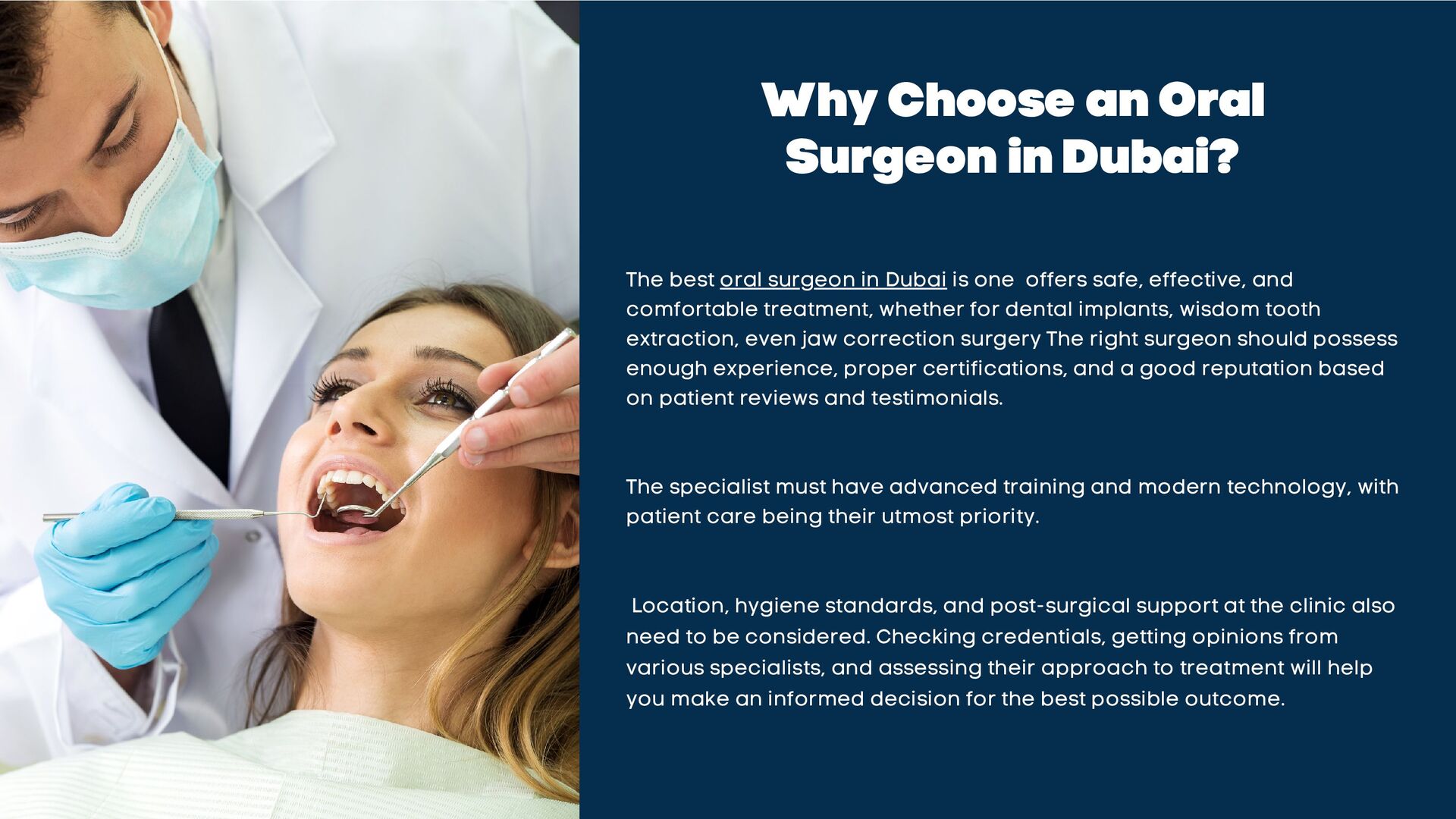 effective, and comfortable treatment, whether for dental implants, wisdom tooth extraction, even jaw correction surgery The right surgeon should possess enough experience, proper certifications, and a good reputation based on patient reviews and testimonials. The specialist must have advanced training and modern technology, with patient care being their utmost priority. Location, hygiene standards, and post-surgical support at the clinic also need to be considered. Checking credentials, getting opinions from various specialists, and assessing their approach to treatment will help you make an informed decision for the best possible outcome. Why Choose an Oral Surgeon in Dubai?