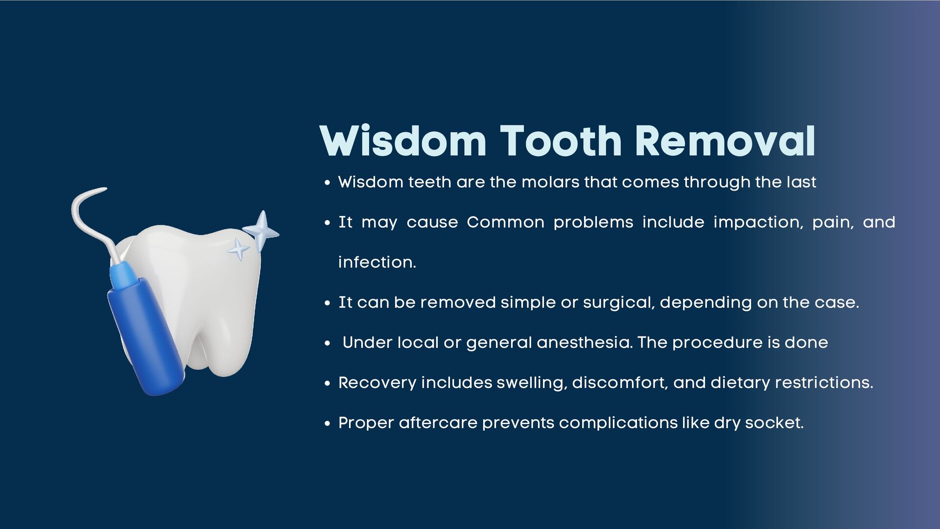It may cause Common problems include impaction, pain, and infection. It can be removed simple or surgical, depending on the case. Under local or general anesthesia. The procedure is done Recovery includes swelling, discomfort, and dietary restrictions. Proper aftercare prevents complications like dry socket. Wisdom Tooth Removal