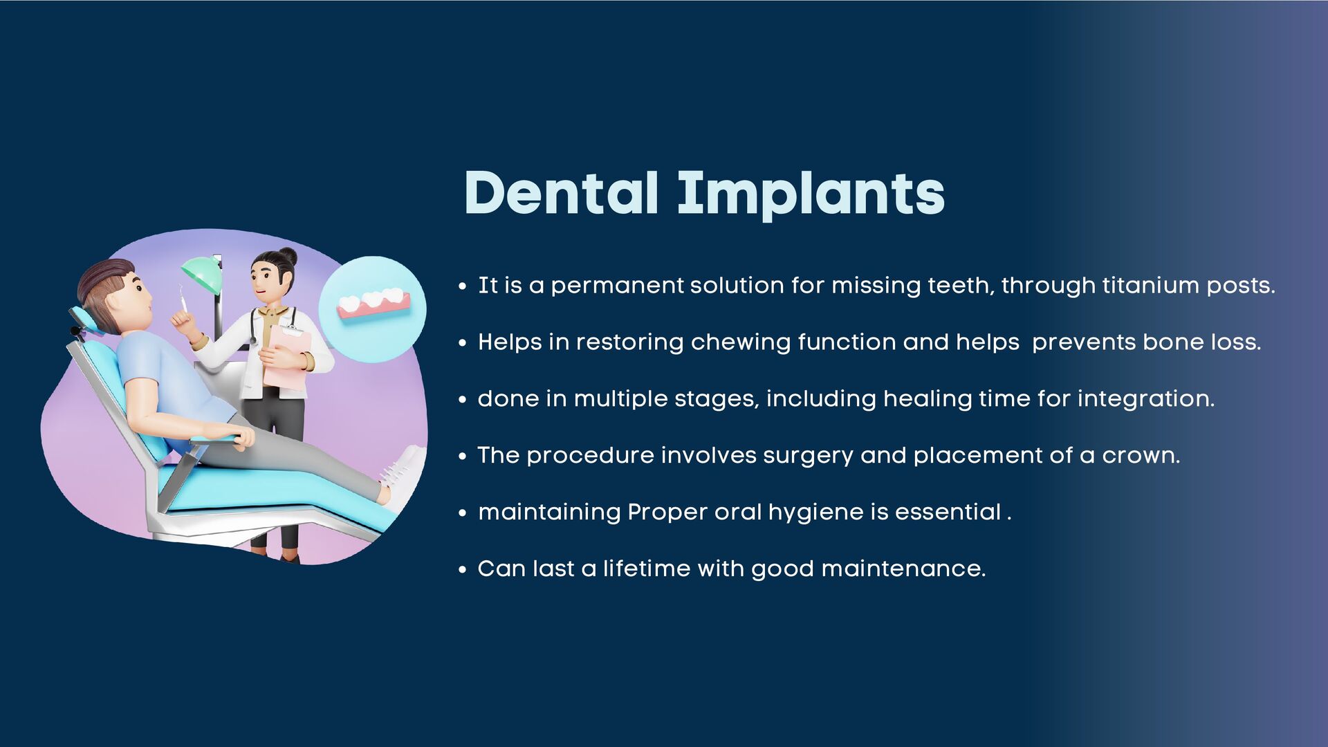 posts. Helps in restoring chewing function and helps prevents bone loss. done in multiple stages, including healing time for integration. The procedure involves surgery and placement of a crown. maintaining Proper oral hygiene is essential . Can last a lifetime with good maintenance. Dental Implants