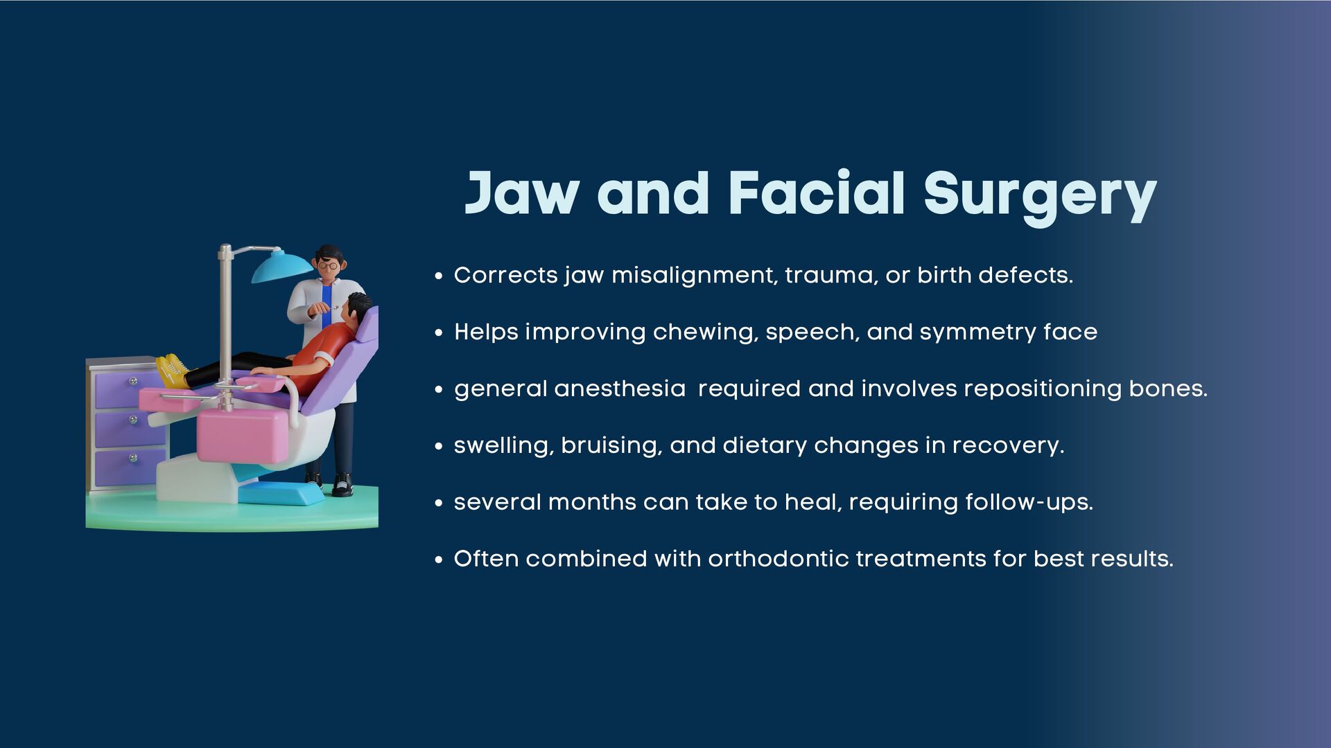 defects. Helps improving chewing, speech, and symmetry face general anesthesia required and involves repositioning bones. swelling, bruising, and dietary changes in recovery. several months can take to heal, requiring follow-ups. Often combined with orthodontic treatments for best results.