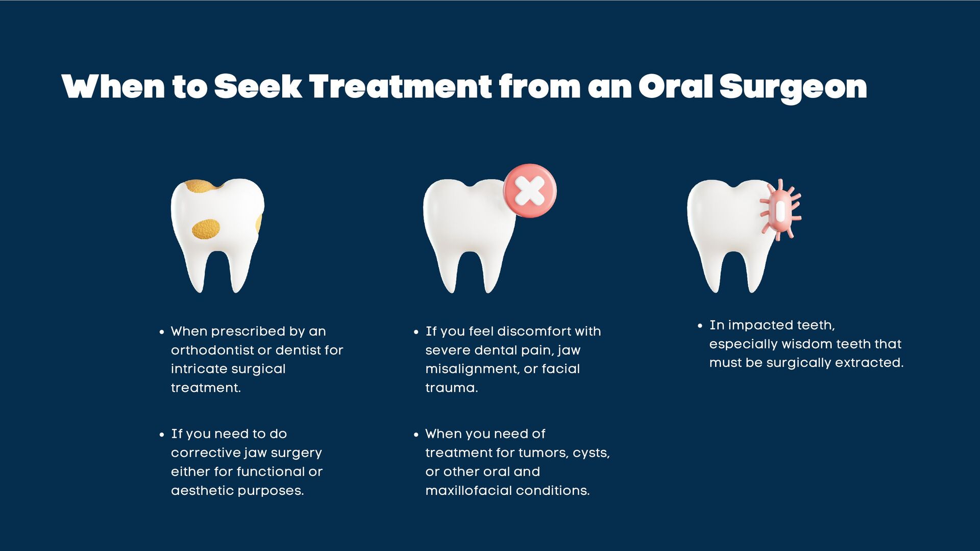 by an orthodontist or dentist for intricate surgical treatment. If you need to do corrective jaw surgery either for functional or aesthetic purposes. When you need of treatment for tumors, cysts, or other oral and maxillofacial conditions. If you feel discomfort with severe dental pain, jaw misalignment, or facial trauma. In impacted teeth, especially wisdom teeth that must be surgically extracted.