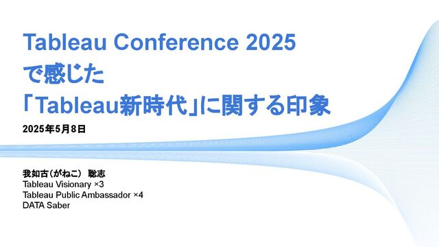 Tableau Conference 2025 で感じた 「Tableau新時代」に関する印象 2025年5月8日 我如古(がねこ) 聡志 Tableau Visionary ×3