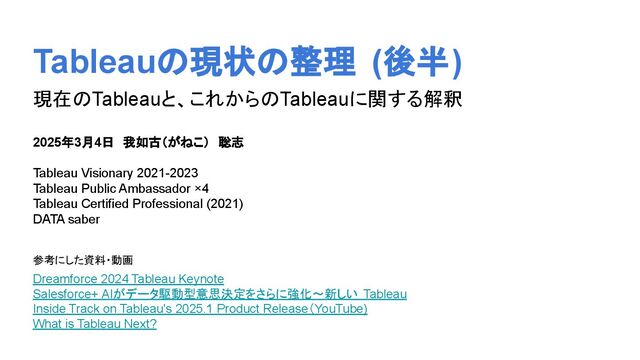 see and understand data then act and collaborate with data. 「新しい Tableau(New Tableau)」=Tableau Next は、今、私たちが使っている Tableauが姿を 変えたものと捉えるのではなく、新しい場所にも Tableauが生まれると考えた方が、解釈がしや す いです。 変化の途上の今の段階では、それぞれの細かい機能を追うのではなく、大きな方向性を 理解および整理し、今後に備えプランを考えおくと良いと感じます。 (この意識で2025 Tableau Conference Keynoteに臨むと良いかもしれません。)