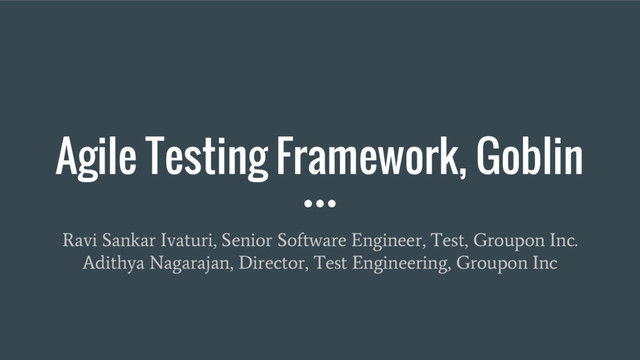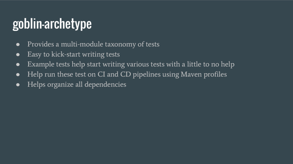 extensible Agile testing framework developed at Groupon, designed to model the agile test quadrants by integrating proven and state-of-the art open source tools and frameworks that help kick-start writing various automated tests for databases, RESTful microservices, user interfaces and messaging systems with minimal effort that helps support Continuous Integration (CI) and Continuous Deployment (CD) pipelines. Goblin is a multi-module Maven project that inherently supports convention-over- configuration with plug-n-play design that ensembles various open source tools and frameworks.