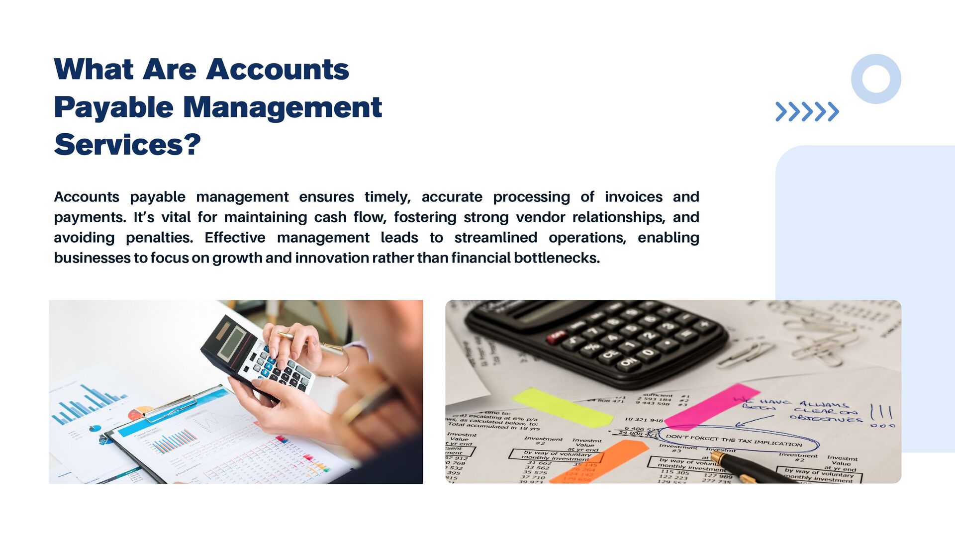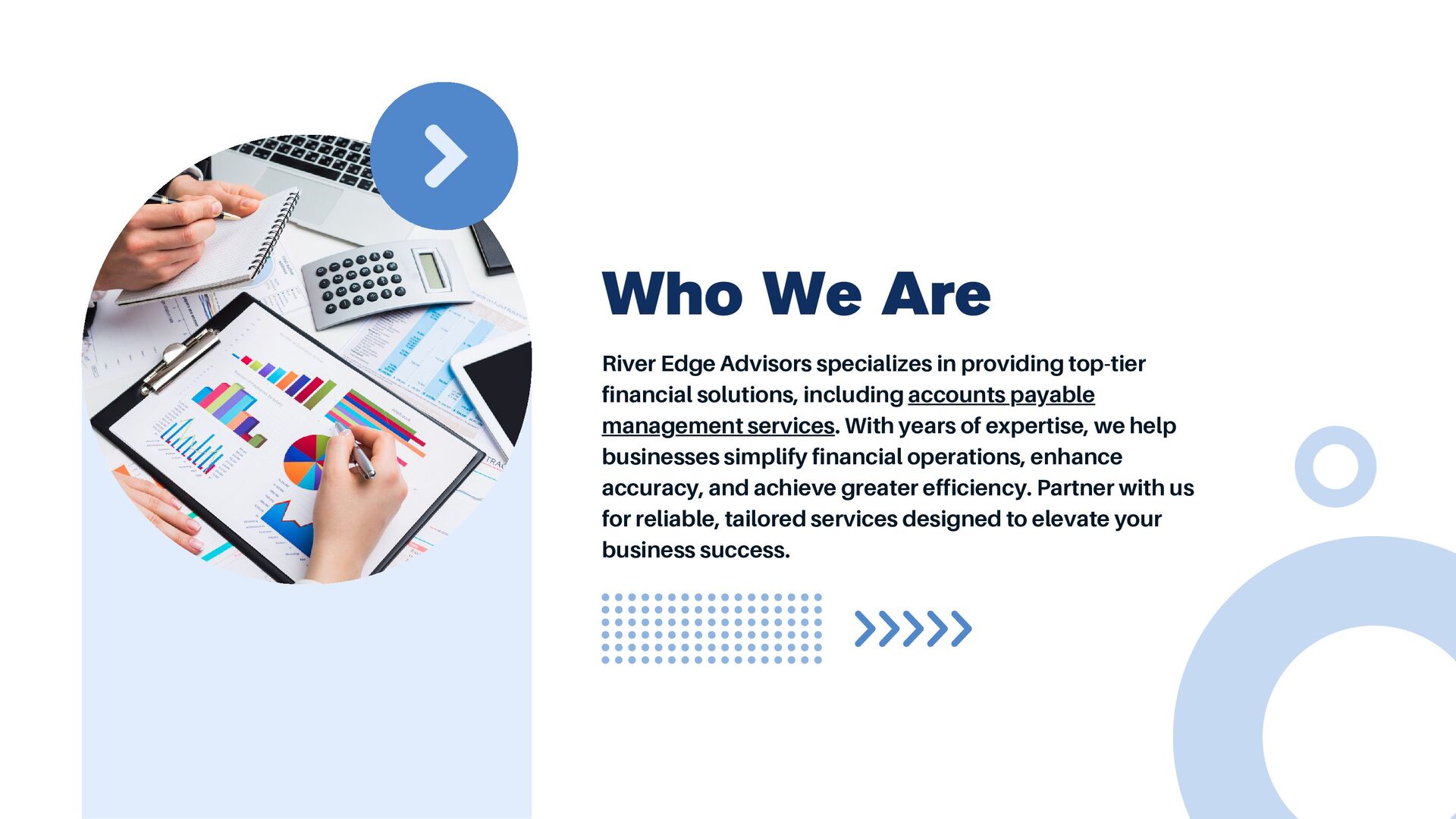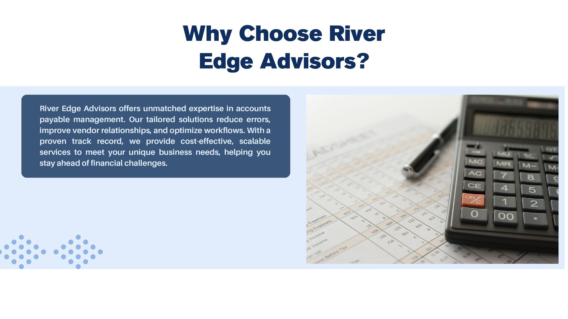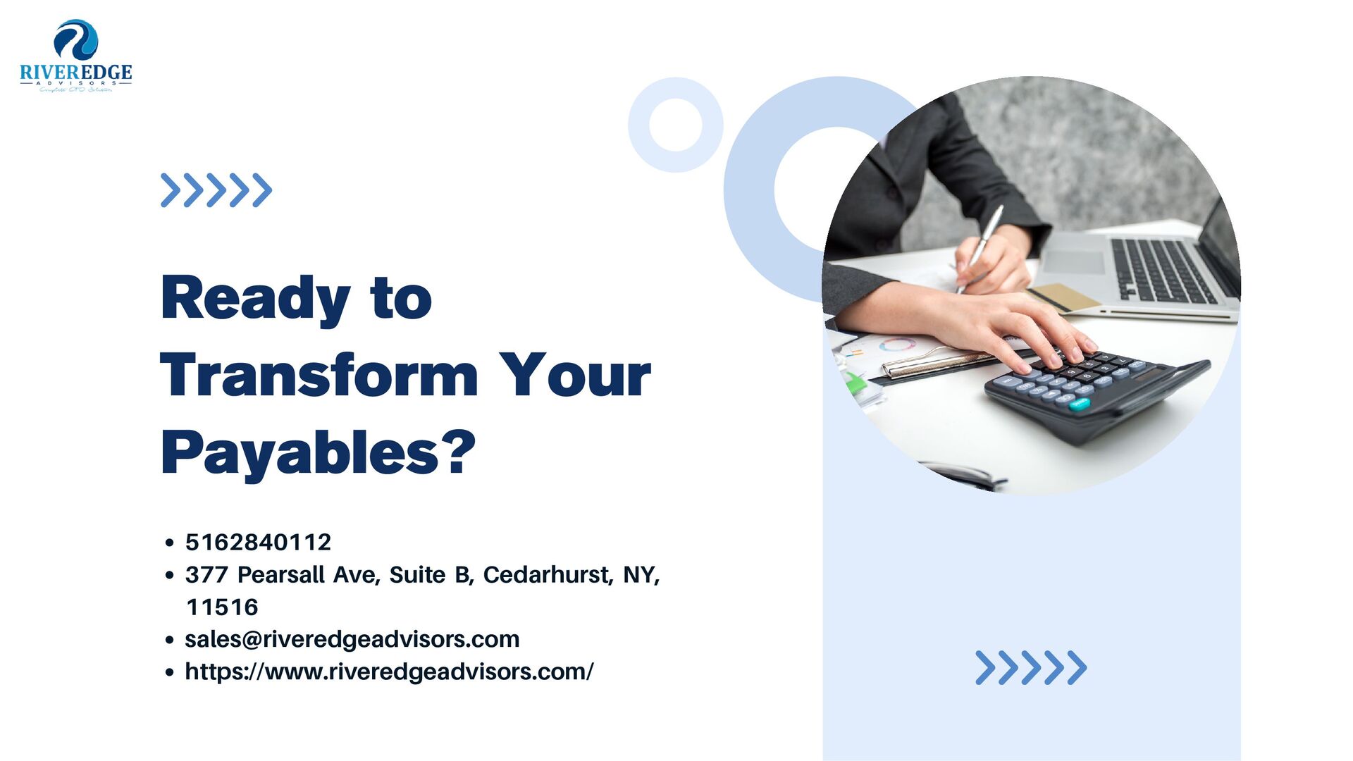 Welcome to River Edge Advisors, your trusted partner in optimizing accounts payable processes. Discover how our tailored solutions streamline workflows, reduce costs, and enhance financial efficiency. Let us help you achieve seamless payables management with innovative strategies and expert guidance. Visit here:- https://www.riveredgeadvisors.com/