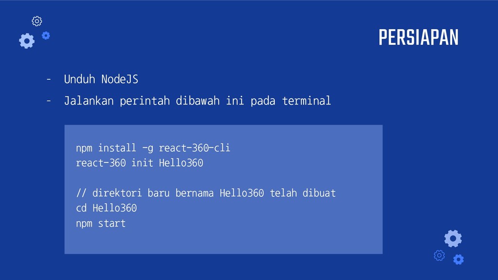 PERSIAPAN npm install -g react-360-cli react-360 init Hello360 // direktori baru bernama Hello360 telah dibuat cd Hello360 npm start