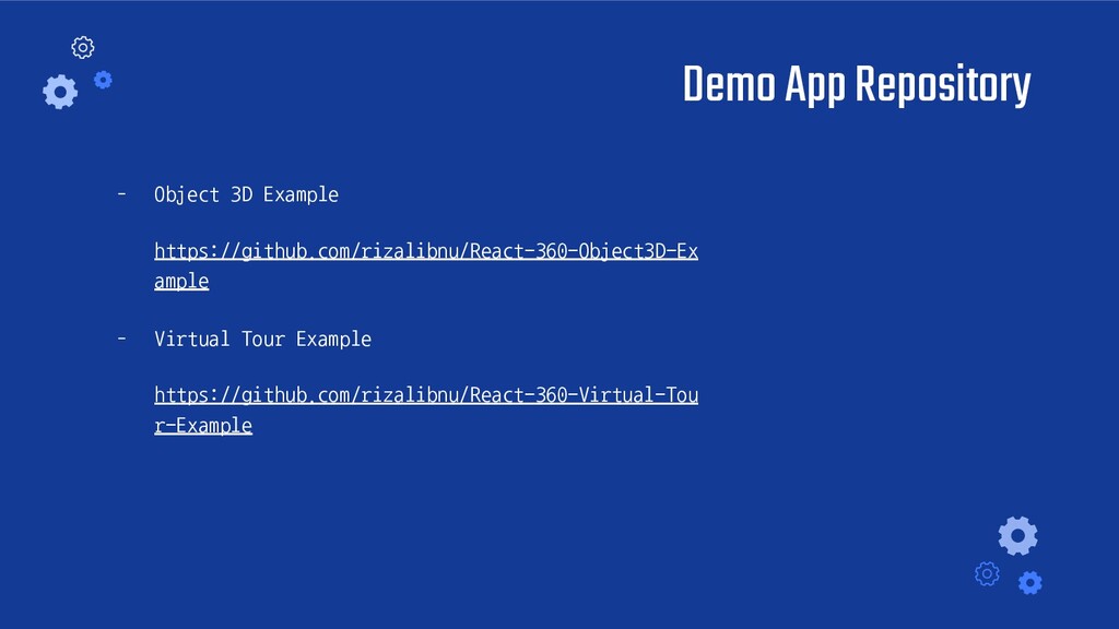 https://github.com/rizalibnu/React-360-Virtual-Tou r-Example Demo App Repository