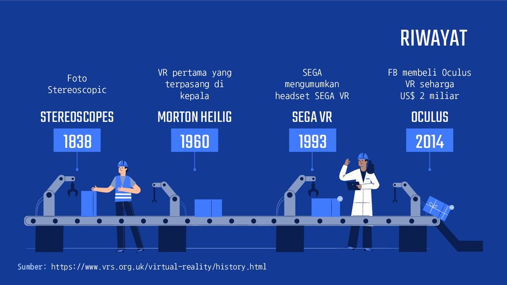 terpasang di kepala SEGA VR SEGA mengumumkan headset SEGA VR OCULUS FB membeli Oculus VR seharga US$ 2 miliar 1960 1993 2014 Sumber: https://www.vrs.org.uk/virtual-reality/history.html