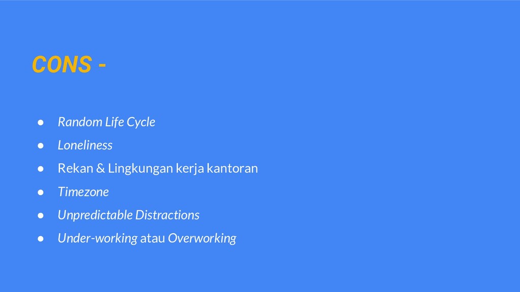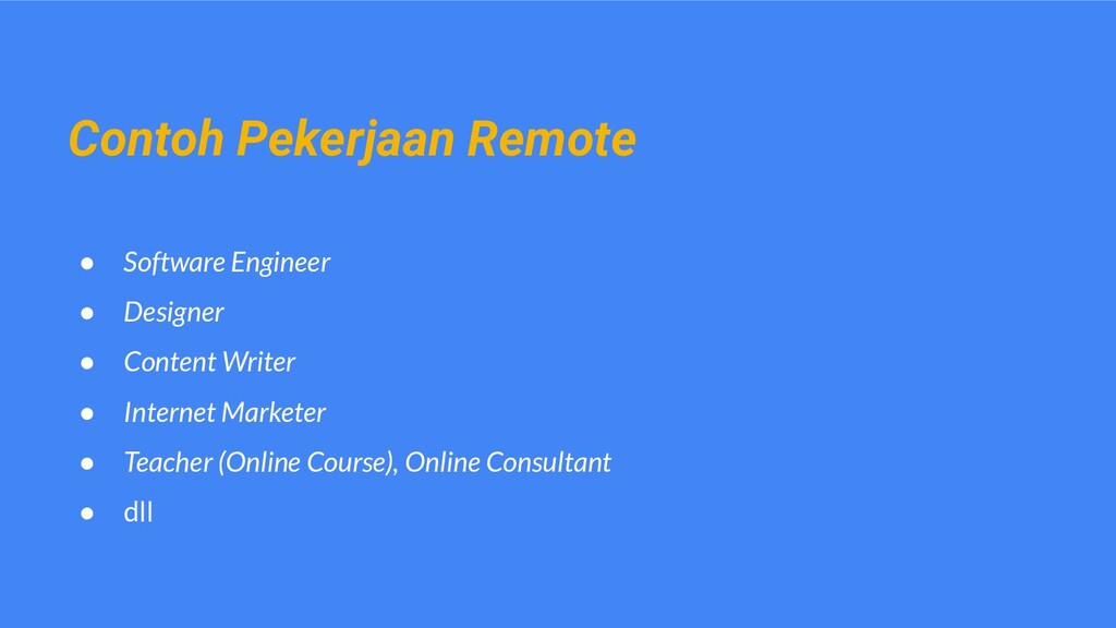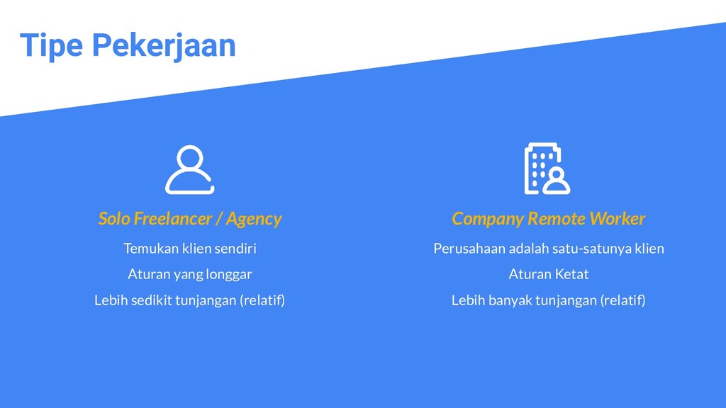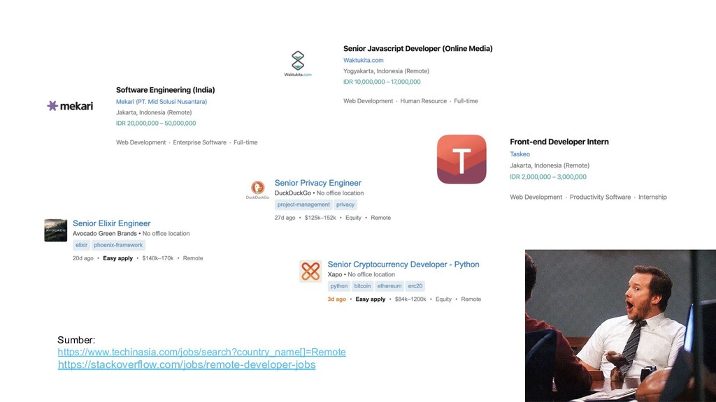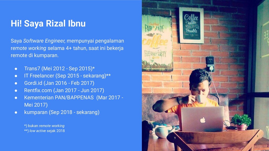 working selama 4+ tahun, saat ini bekerja remote di kumparan. • Trans7 (Mei 2012 - Sep 2015)* • IT Freelancer (Sep 2015 - sekarang)** • Gordi.id (Jan 2016 - Feb 2017) • Rentfix.com (Jan 2017 - Jun 2017) • Kementerian PAN/BAPPENAS (Mar 2017 - Mei 2017) • kumparan (Sep 2018 - sekarang) *) bukan remote working **) low active sejak 2018