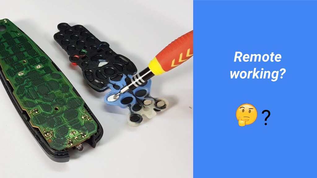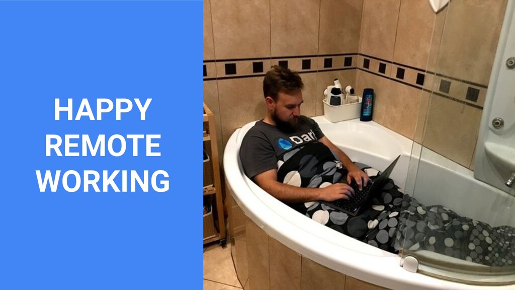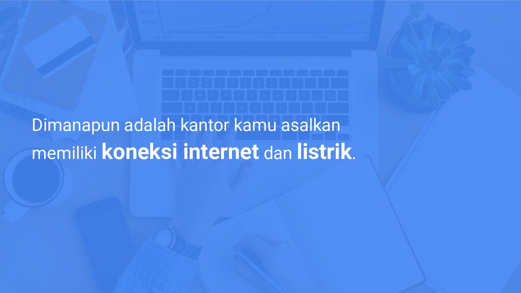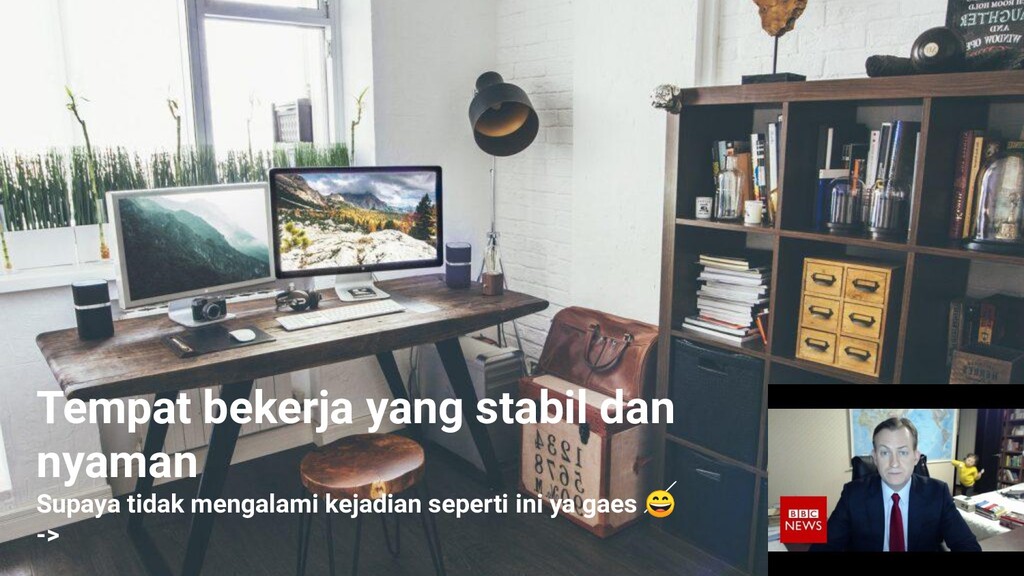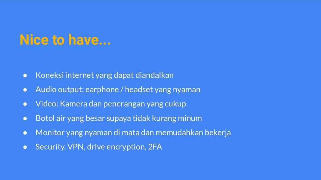 Audio output: earphone / headset yang nyaman • Video: Kamera dan penerangan yang cukup • Botol air yang besar supaya tidak kurang minum • Monitor yang nyaman di mata dan memudahkan bekerja • Security. VPN, drive encryption, 2FA