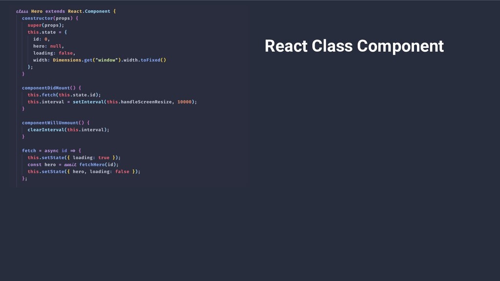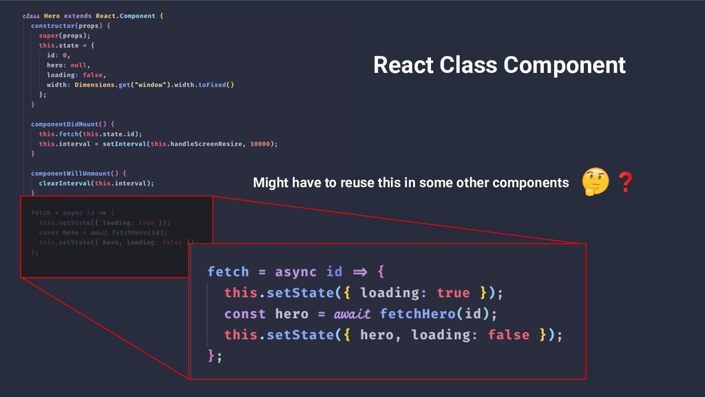 stateful logic • Huge component • Class is confusing (for both humans and machines)