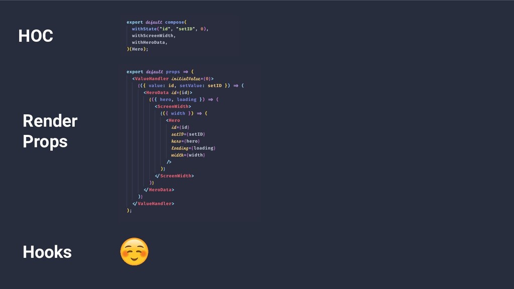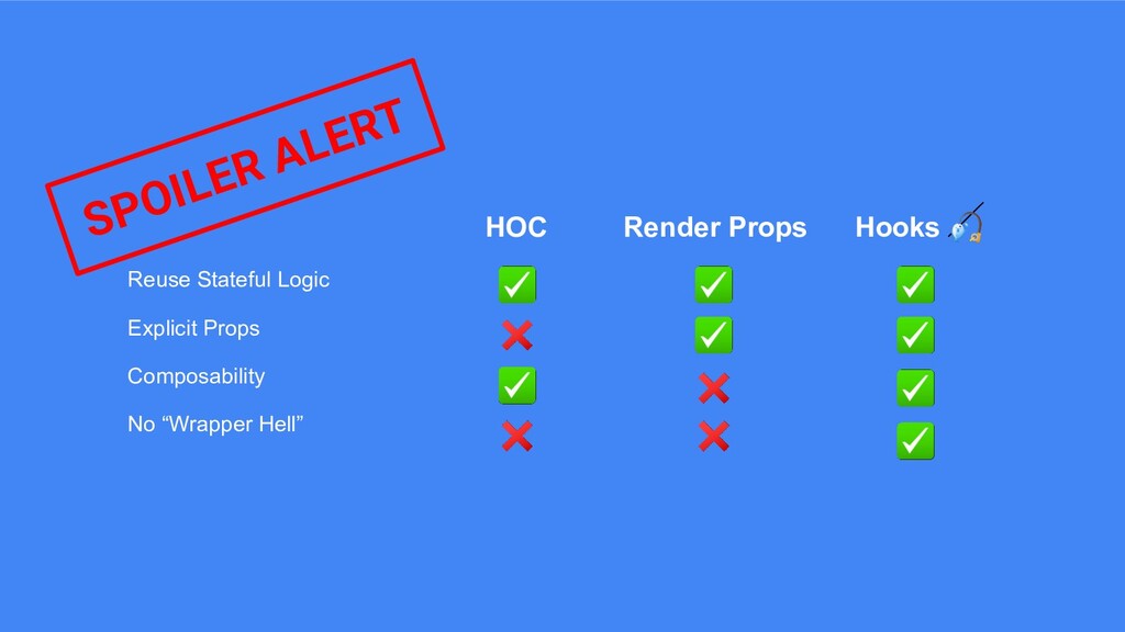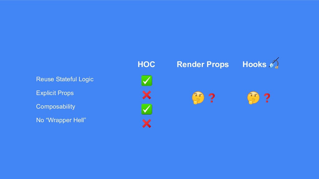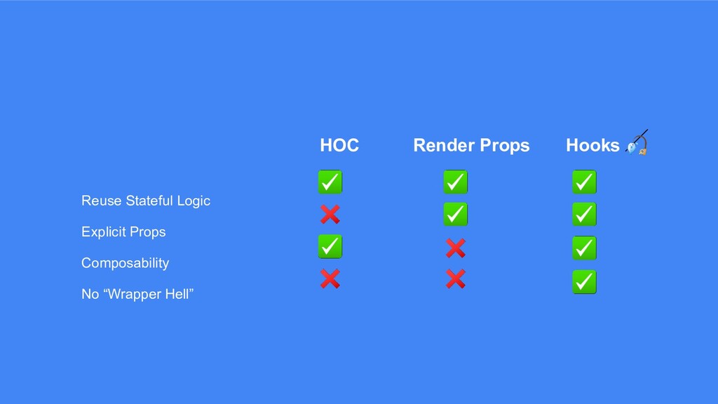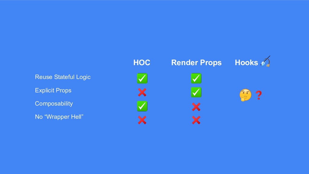 HOC Render Props Hooks Reuse Stateful Logic Explicit Props Composability