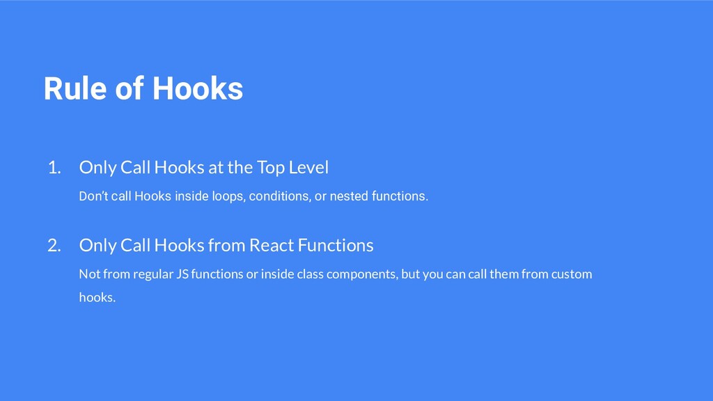 Level Don’t call Hooks inside loops, conditions, or nested functions. 2. Only Call Hooks from React Functions Not from regular JS functions or inside class components, but you can call them from custom hooks.