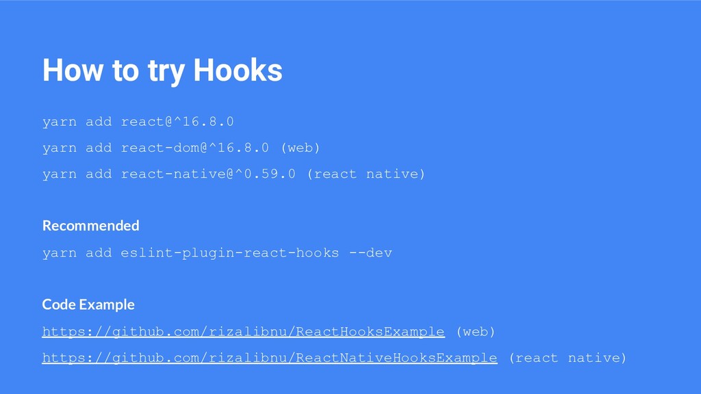 (web) yarn add react-native@^0.59.0 (react native) Recommended yarn add eslint-plugin-react-hooks --dev Code Example https://github.com/rizalibnu/ReactHooksExample (web) https://github.com/rizalibnu/ReactNativeHooksExample (react native)