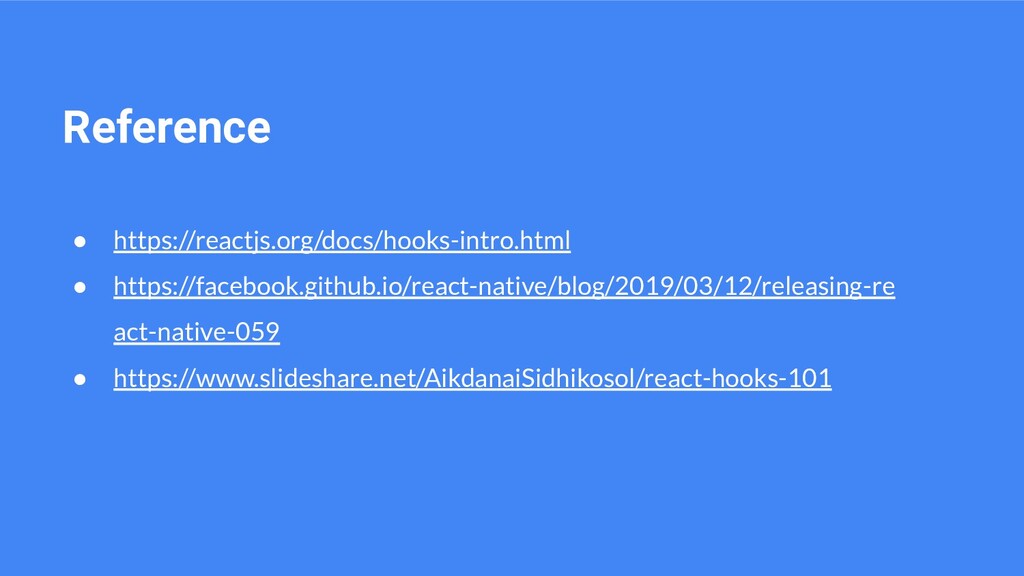 Reference • https://reactjs.org/docs/hooks-intro.html • https://facebook.github.io/react-native/blog/2019/03/12/releasing-re act-native-059 • https://www.slideshare.net/AikdanaiSidhikosol/react-hooks-101
