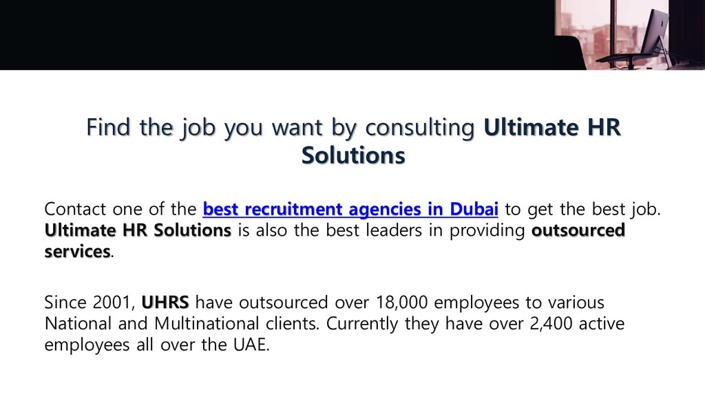 Contact one of the best recruitment agencies in Dubai to get the best job. Ultimate HR Solutions is also the best leaders in providing outsourced services. Since 2001, UHRS have outsourced over 18,000 employees to various National and Multinational clients. Currently they have over 2,400 active employees all over the UAE.